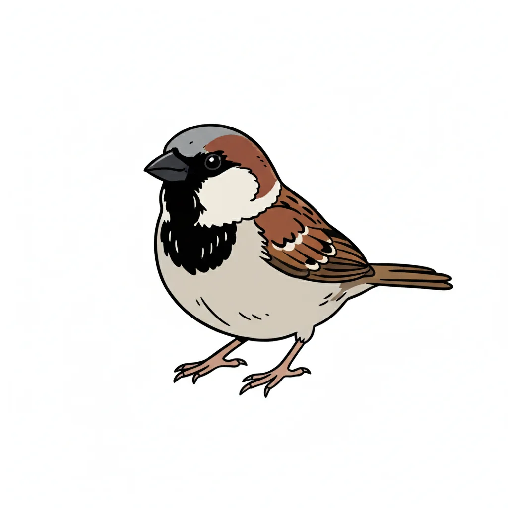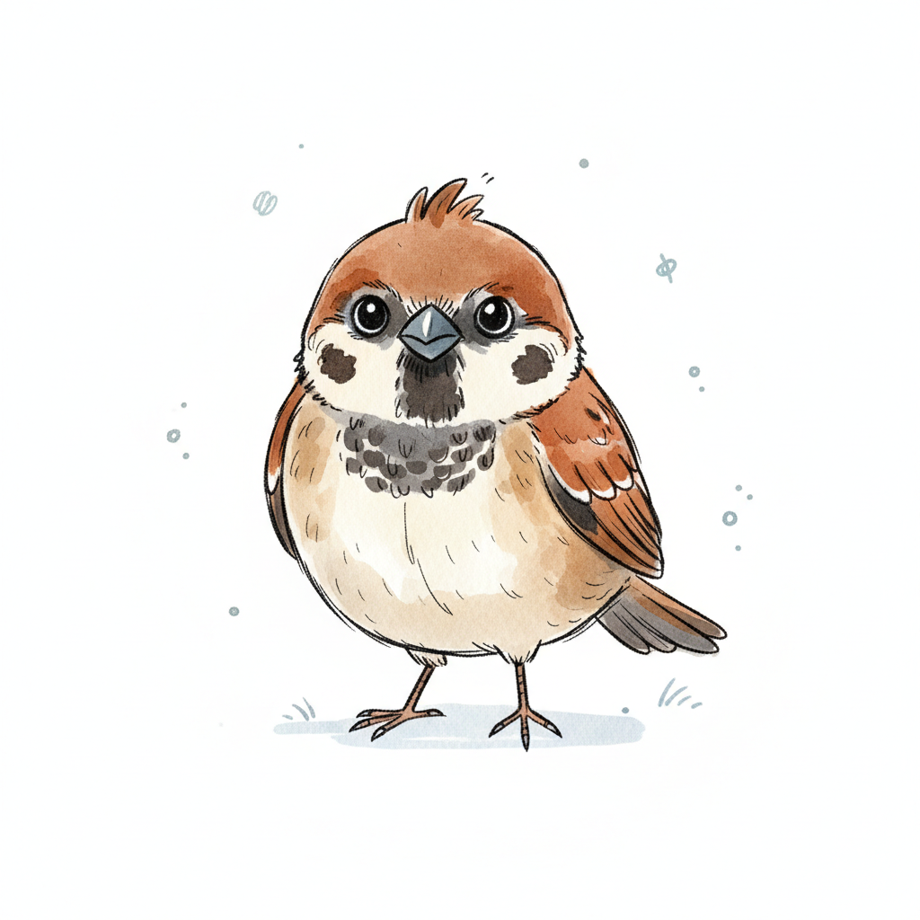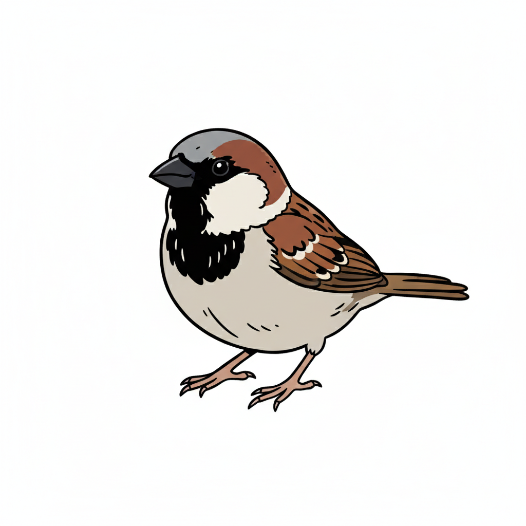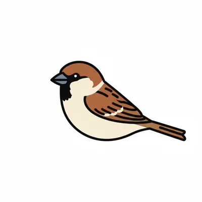 Ein illustrierter Spatz mit braunem Gefieder und kurzer Schnauze.