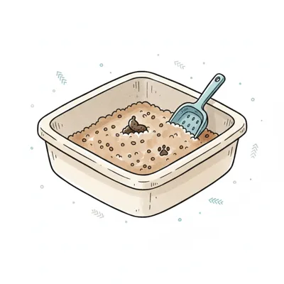 Eine Katzentoilette mit Streu und einem kleinen Schaufelwerkzeug.