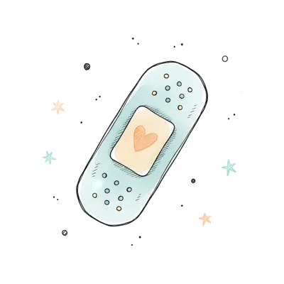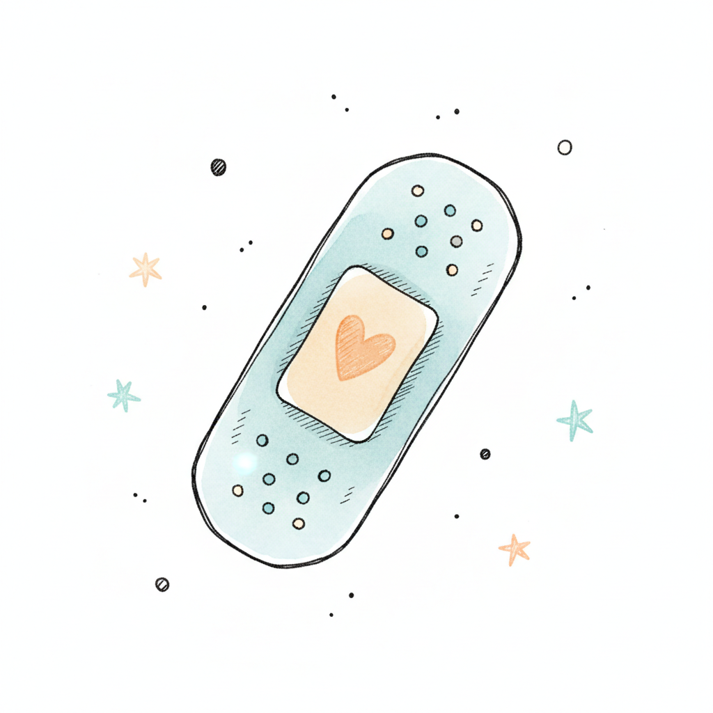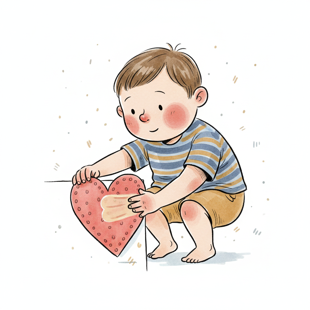 Ein kleiner Junge klebt ein Pflaster auf ein rotes Herz, ein Symbol für Fürsorge und Heilung.