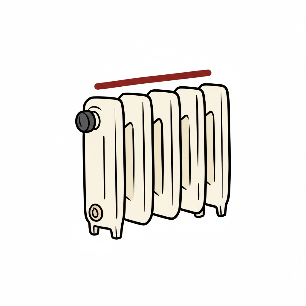 Schwarz-weiße Skizze eines klassischen Heizkörpers mit mehreren Rippen und Ventil.