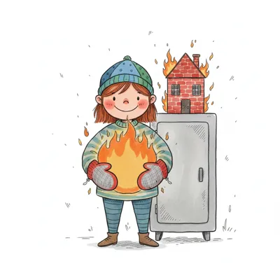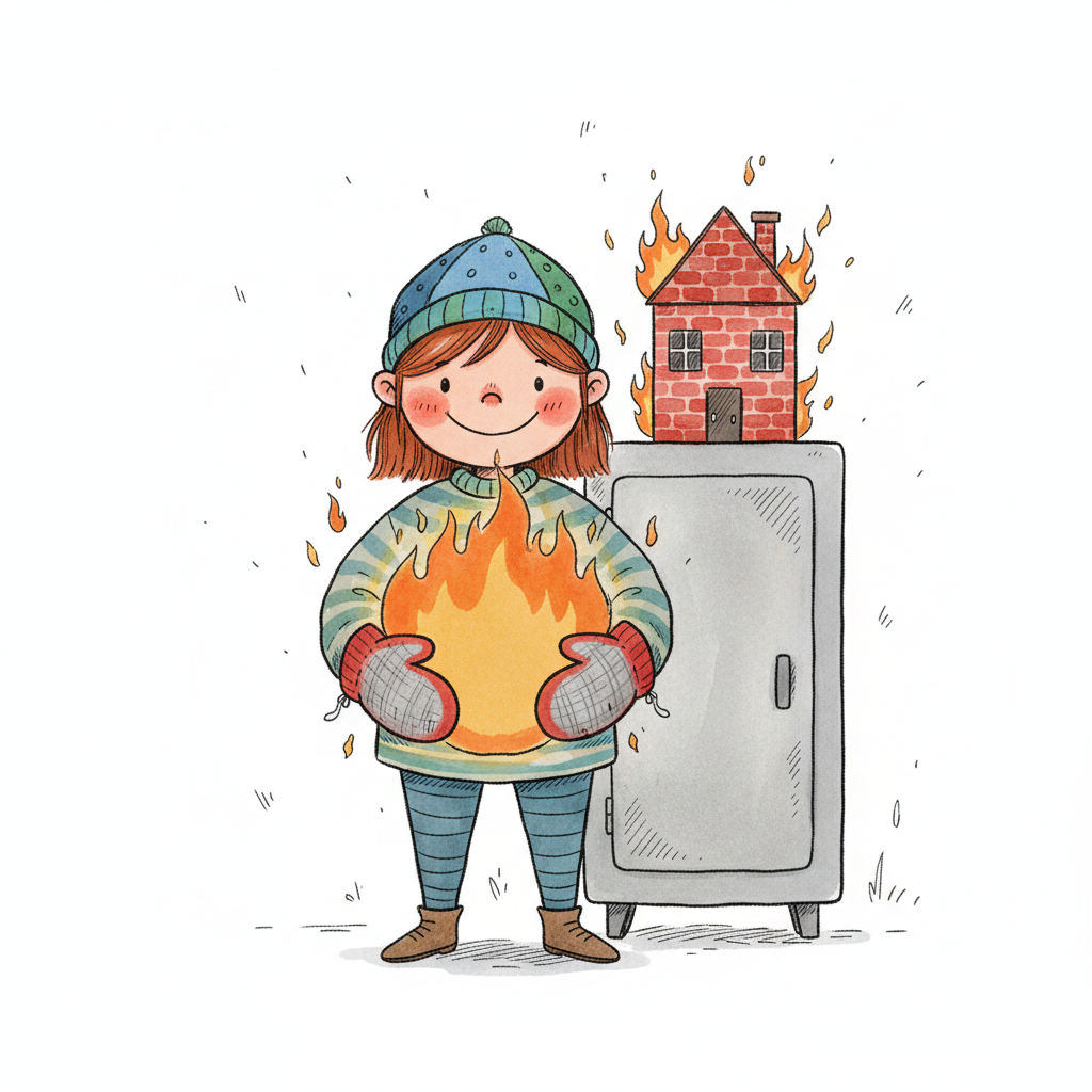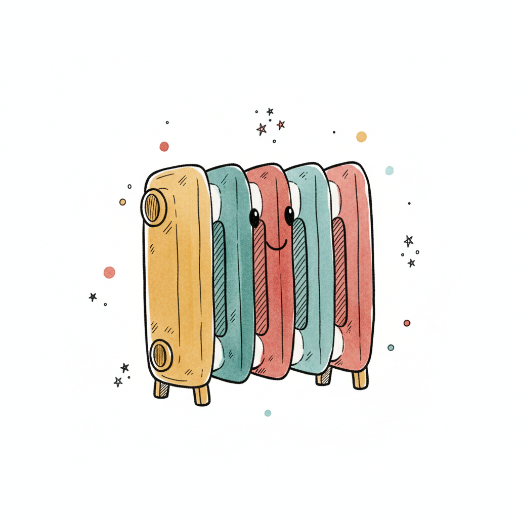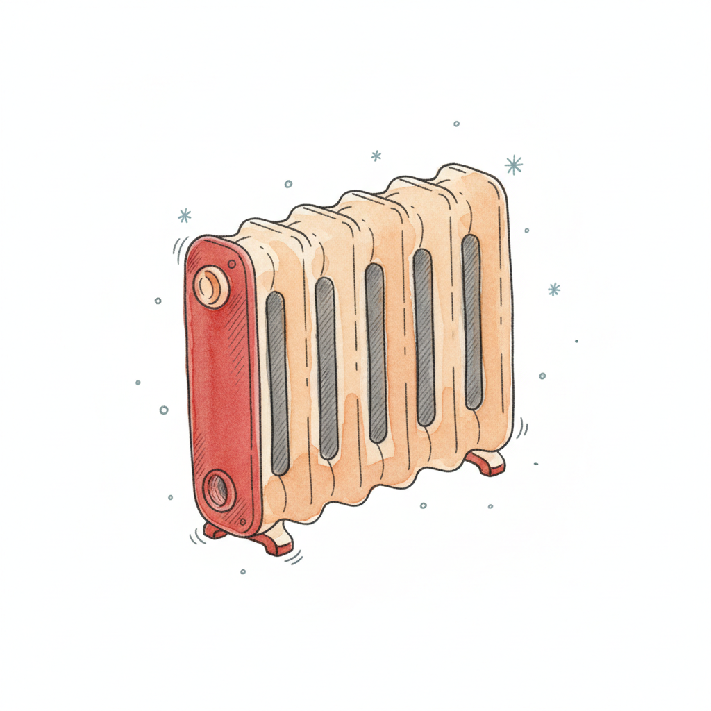 Cartoon-Illustration eines Heizkörpers in warmen Farben, der heizt und Wärme abgibt.