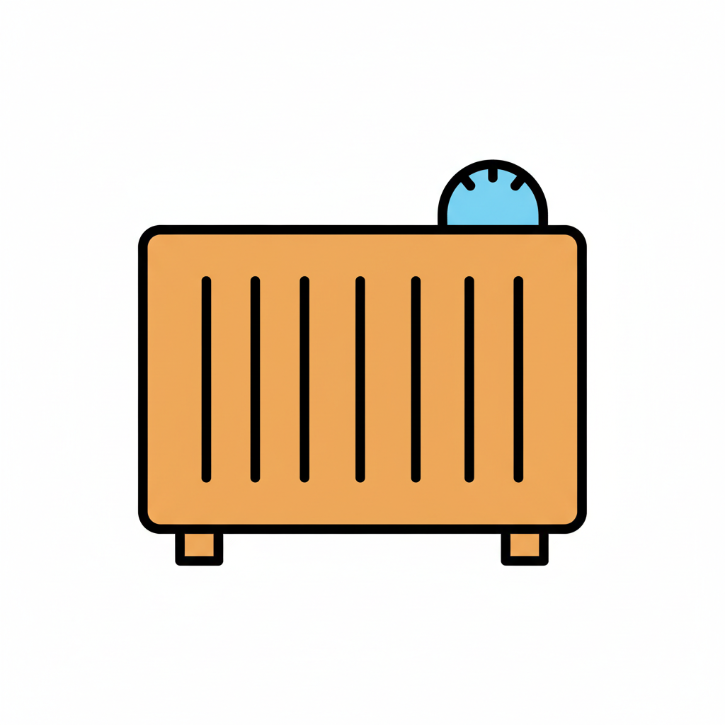 Orangefarbener Heizkörper mit vertikalen Lamellen und blauem Thermostat-Regler, einfache Darstellung.