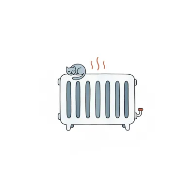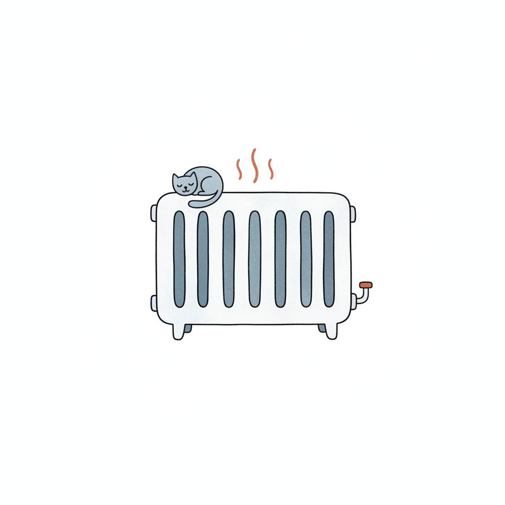 Eine graue Katze schläft gemütlich auf einem warmen Heizkörper, der Wärme abgibt.