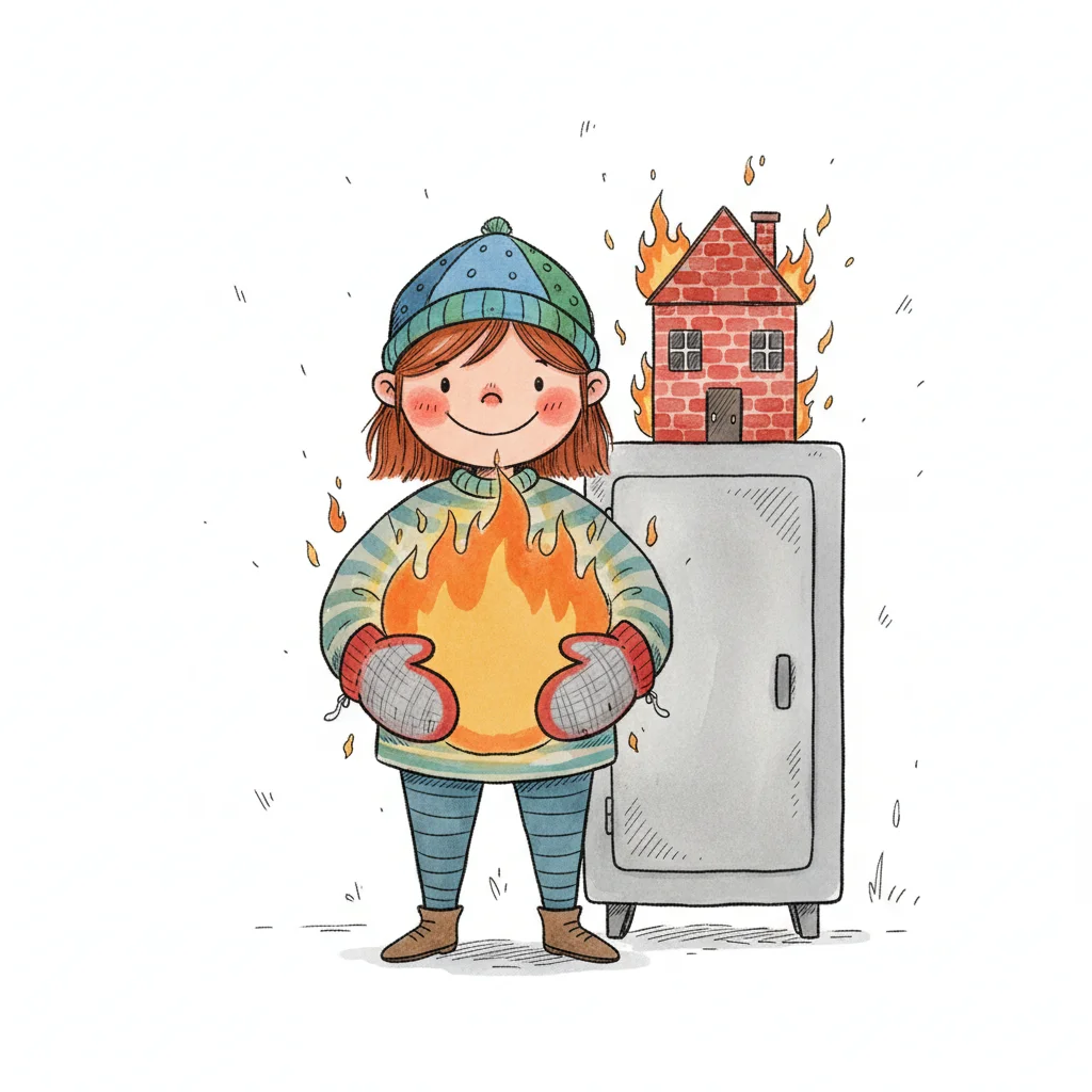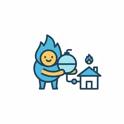 Ein freundlicher Flammen-Charakter versorgt ein Haus mit Gas aus einem Tank.