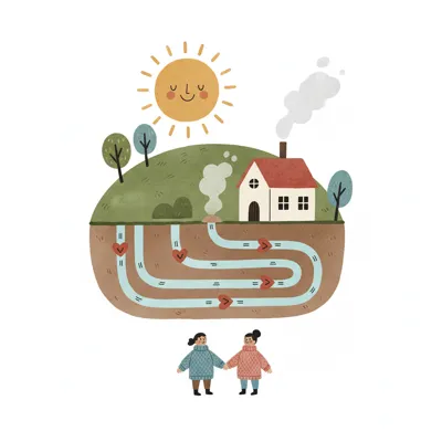 Illustration: Haus mit Geothermie-Heizung, Sonne und zwei Kindern. Nachhaltige Energie.