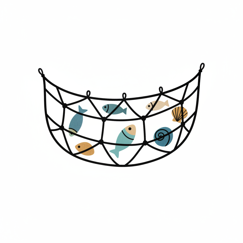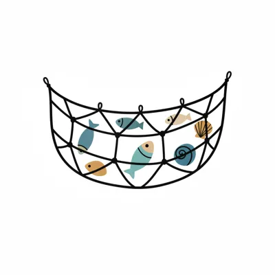 Ein Netz mit stilisierten Fischen und einem Muschelmotiv.