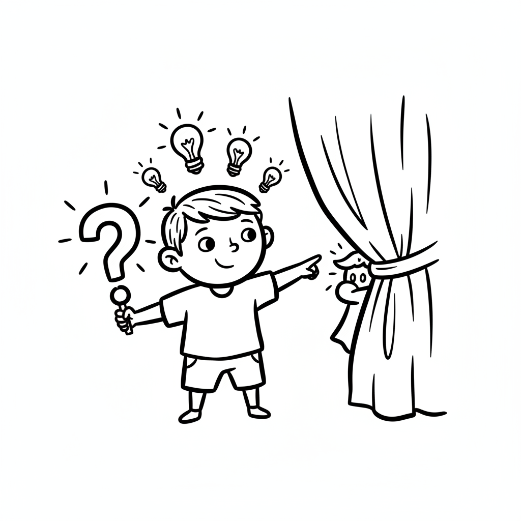 Ein neugieriger Junge mit Ideen und einem Fragezeichen entdeckt etwas hinter einem Vorhang.