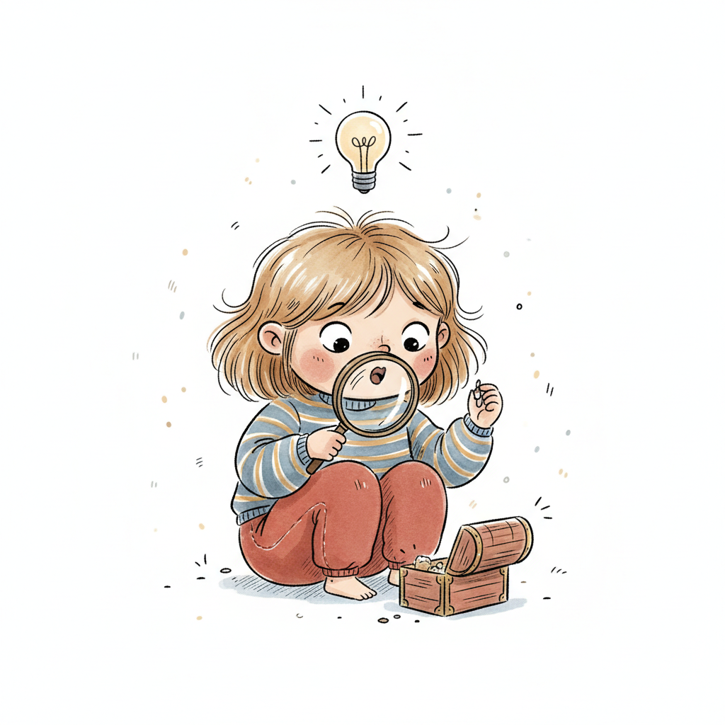 Niedliches Kind untersucht mit Lupe einen Schatz, über dem eine Glühbirne leuchtet.