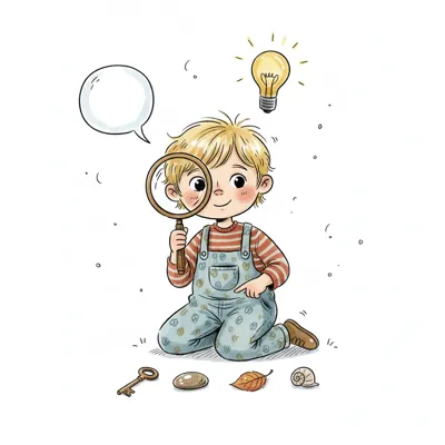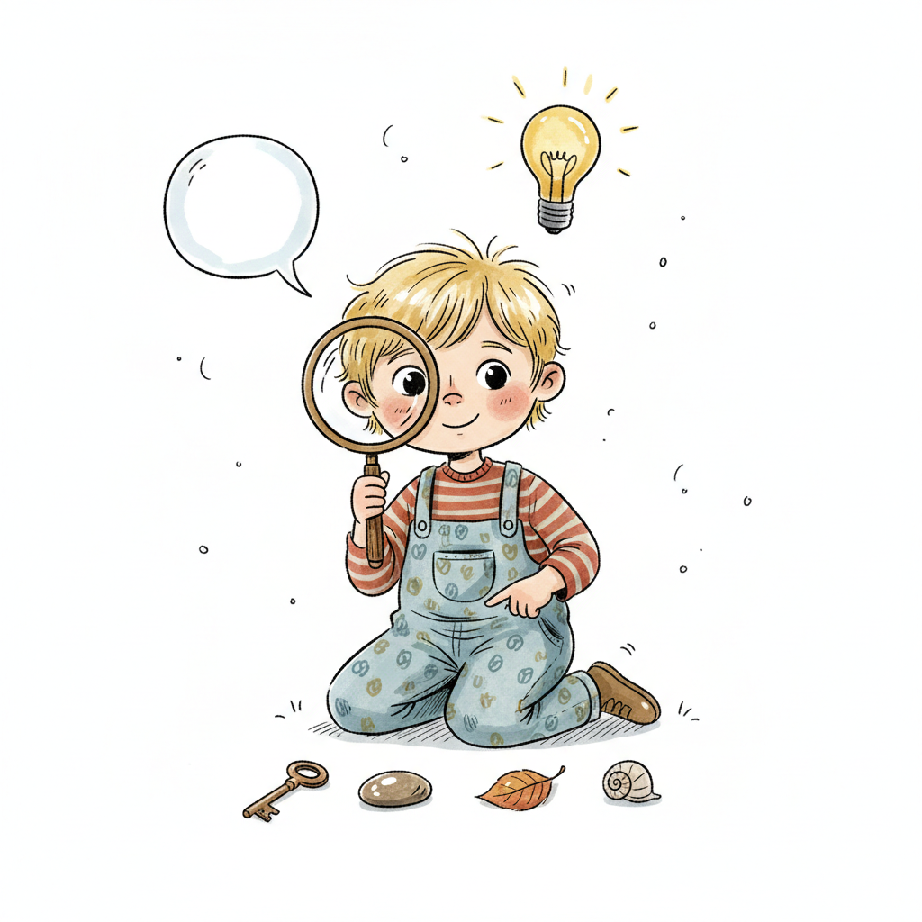 Kind mit Lupe untersucht Fußspuren, hat Ideen. Symbolisiert Neugier, Entdeckung und Problemlösung.