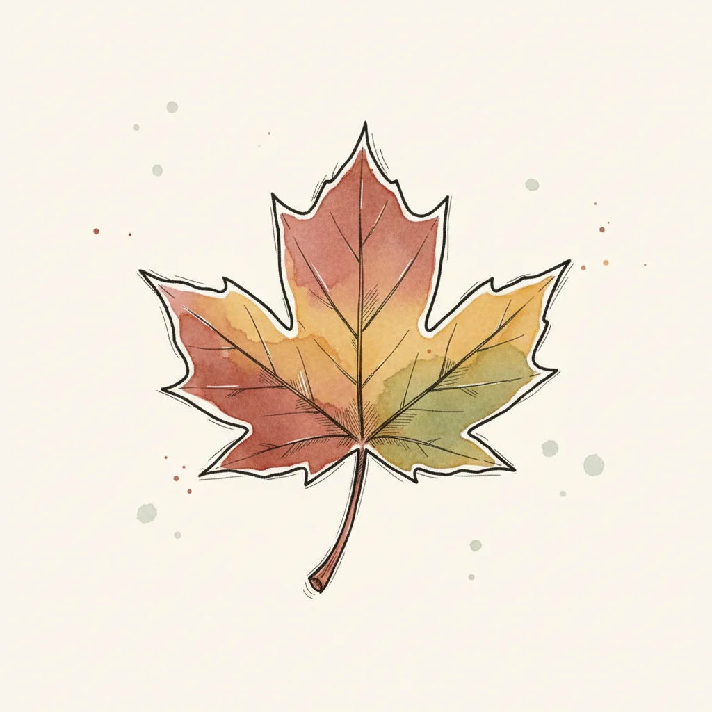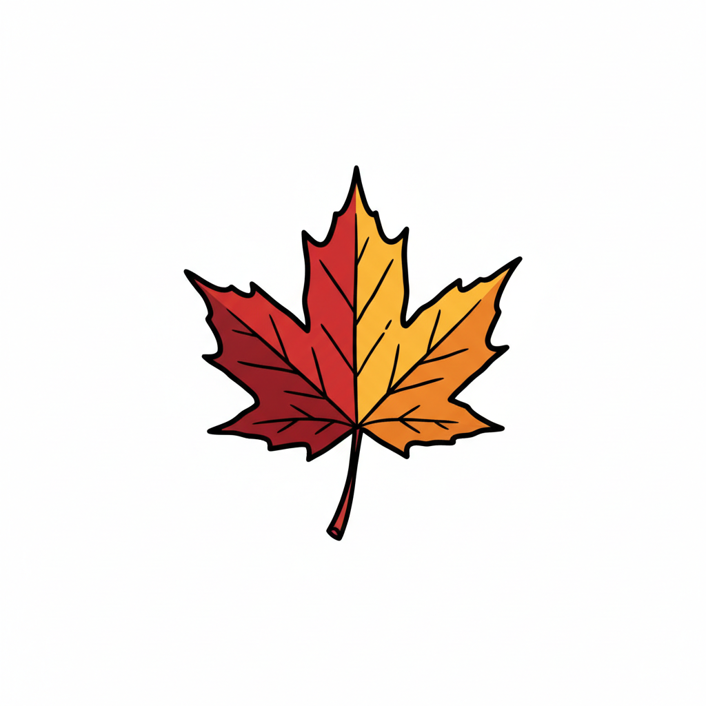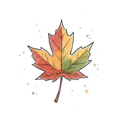 Illustriertes Ahornblatt in Herbstfarben, halb rot, halb orange/gelb.