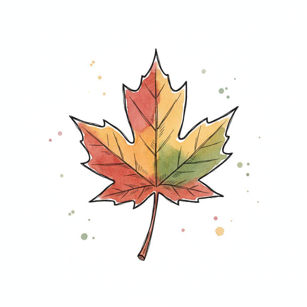 Aquarell-Ahornblatt in Herbstfarben mit schwarzer Umrandung auf hellem Hintergrund.