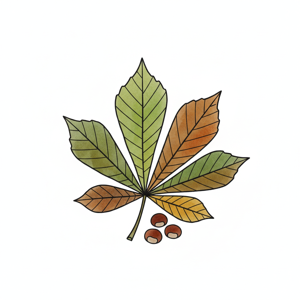 Aquarellzeichnung eines Kastanienblattes in Herbstfarben mit drei Kastanien.