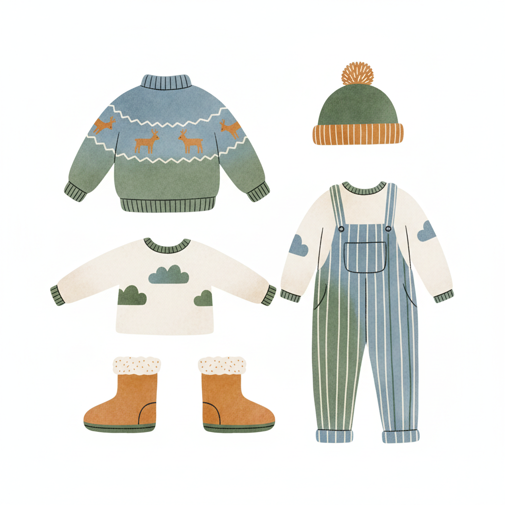 Illustration von Kinderkleidung: Pullover, Latzhose, Mütze, Stiefel in sanften Herbstfarben.