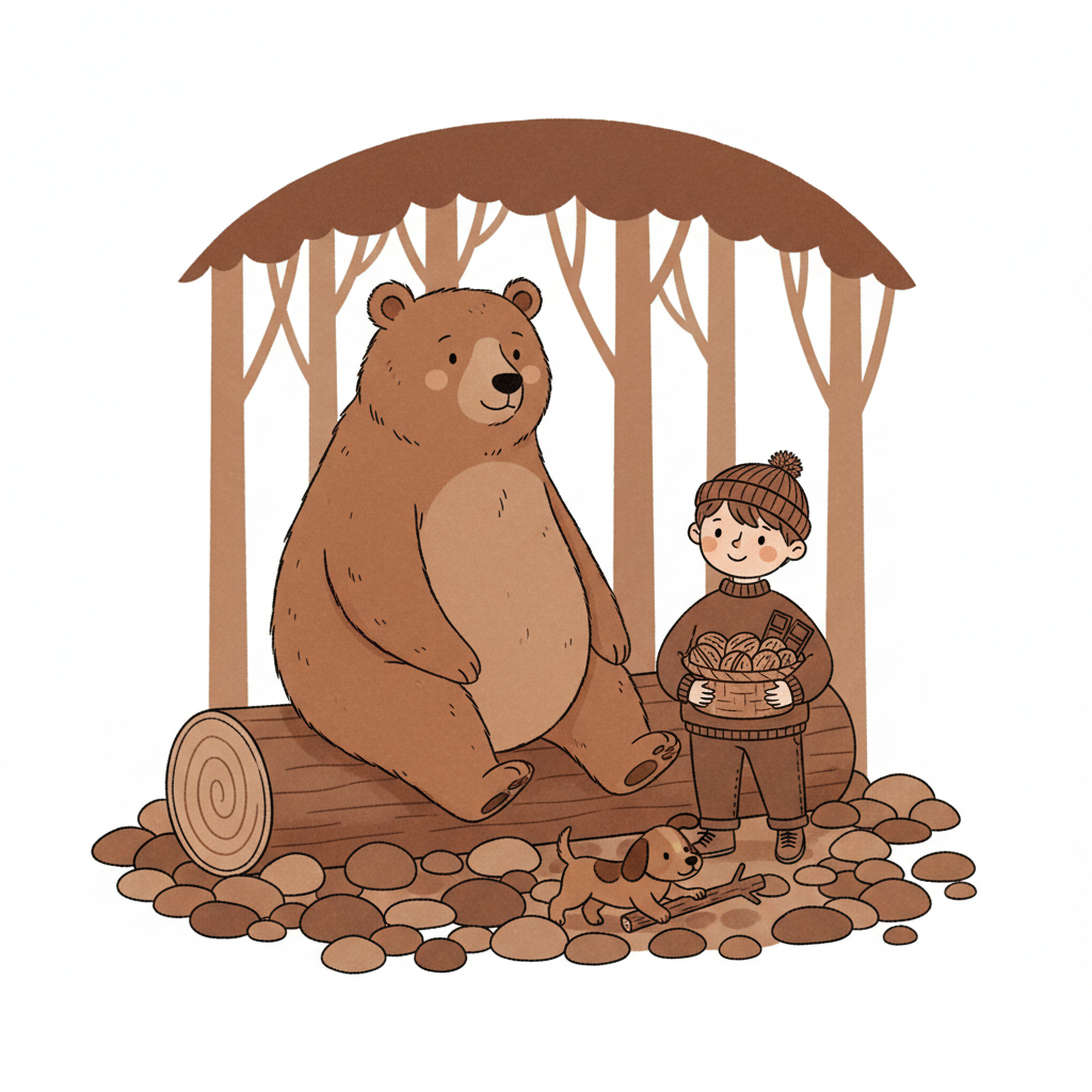 Ein Bär, ein Junge mit Korb und ein Hund sitzen/spielen im Wald. Warme Herbstfarben.