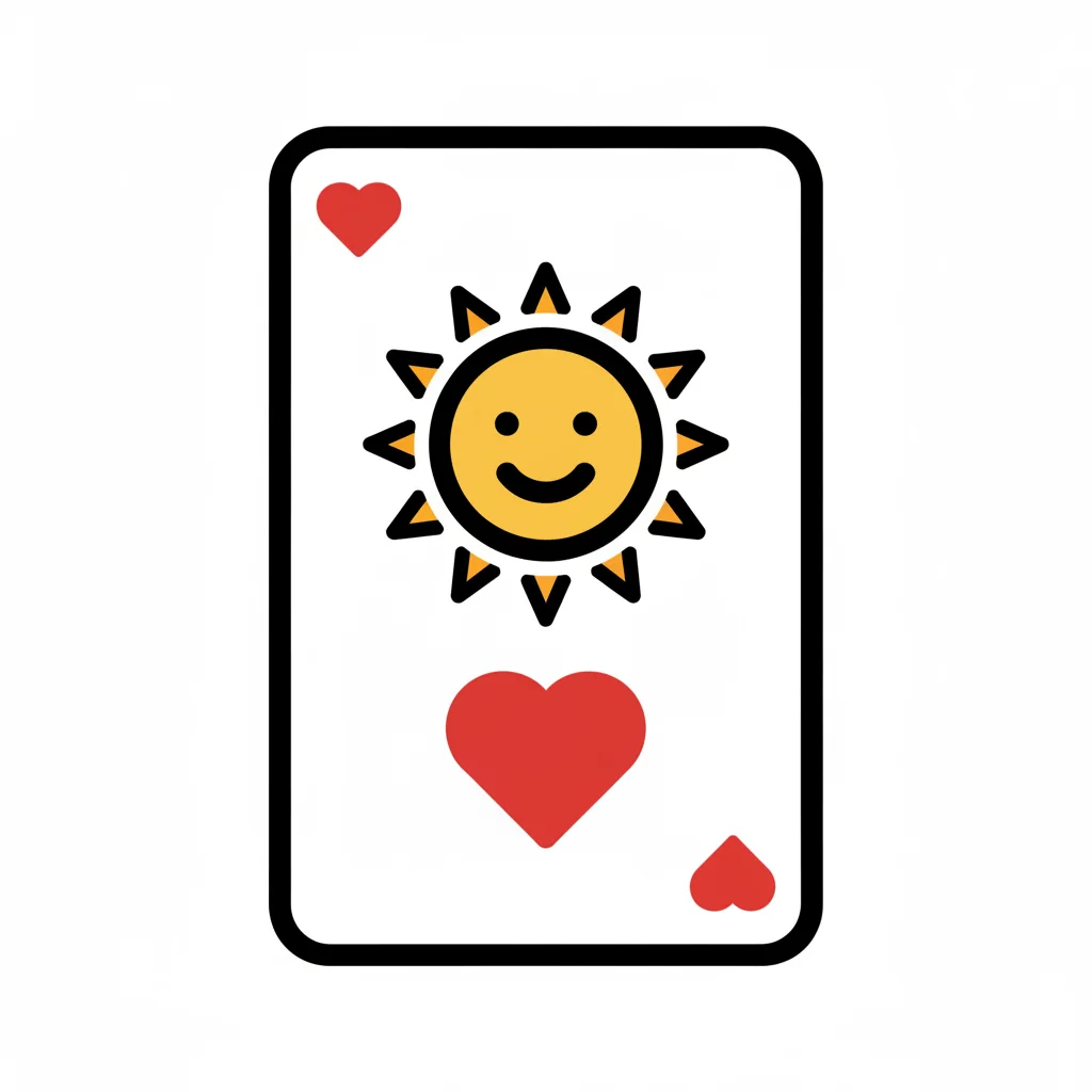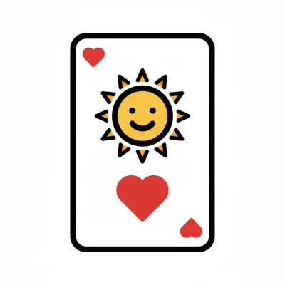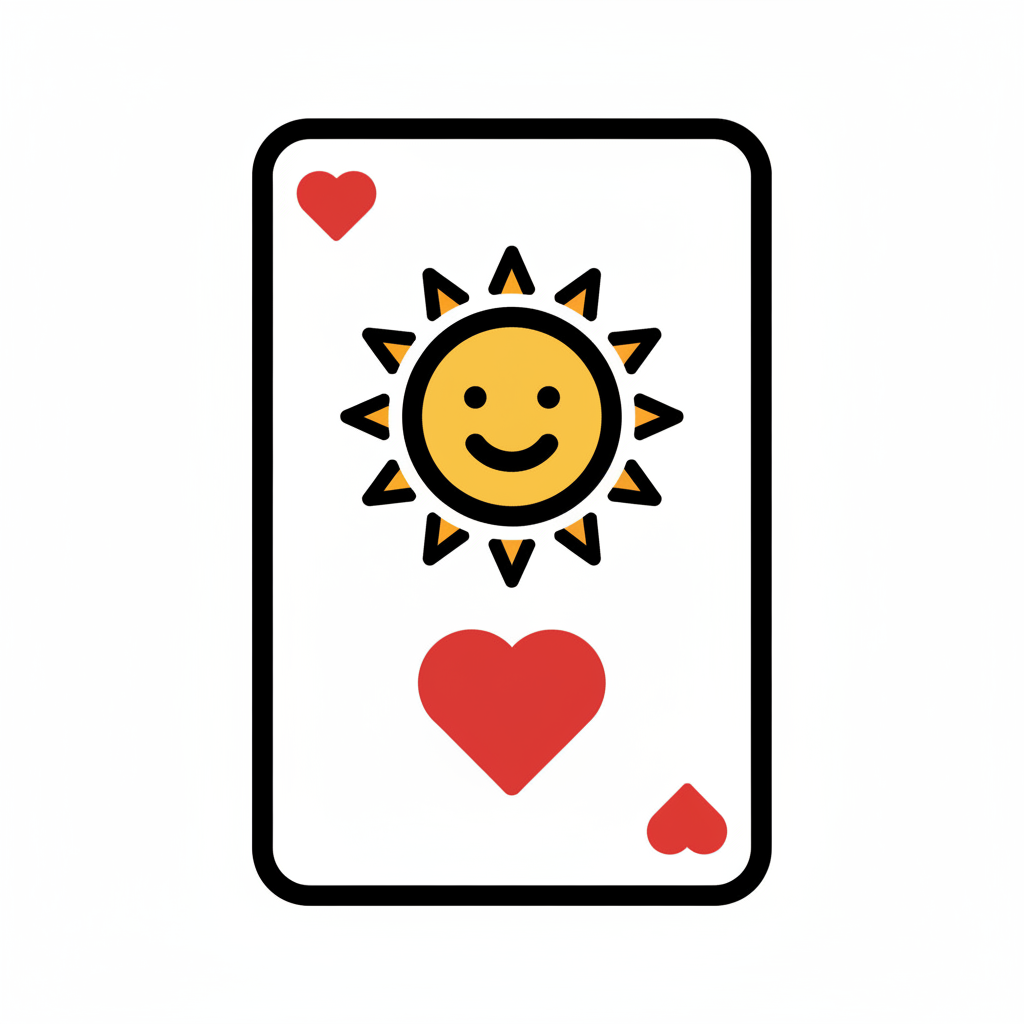 Eine Spielkarte mit einer Sonne und roten Herzen.