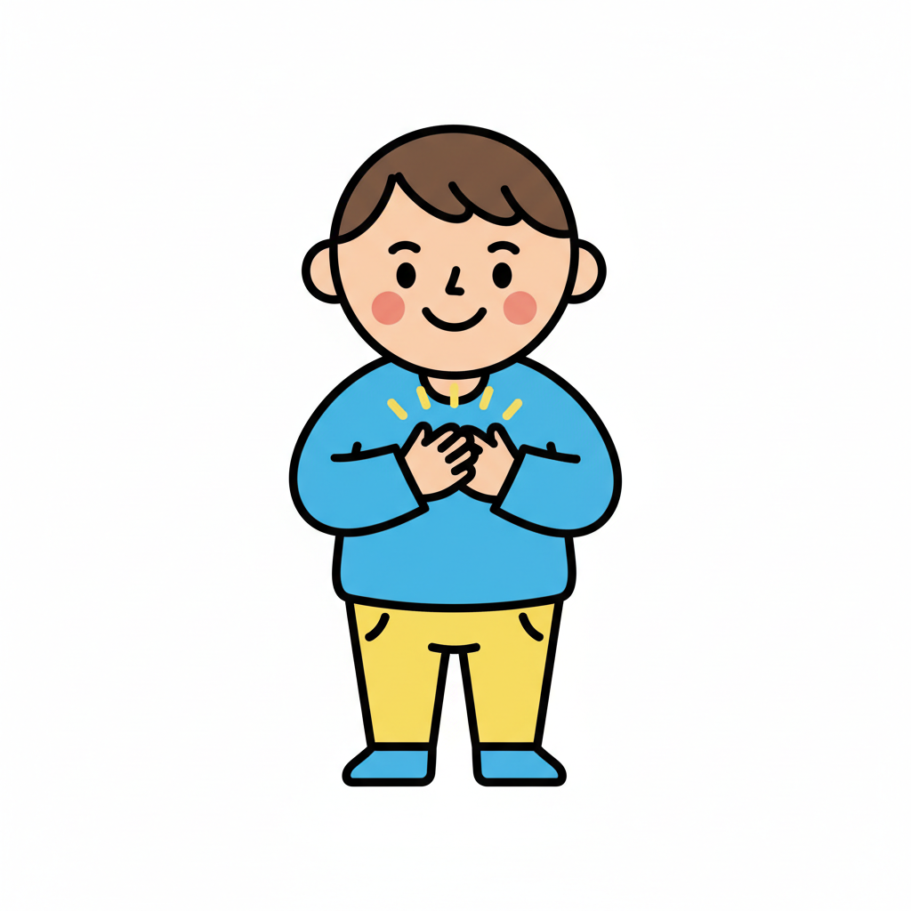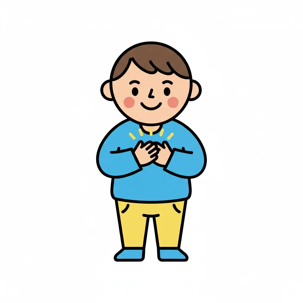 Ein fröhlicher Junge steht mit Händen vor dem Herzen da.