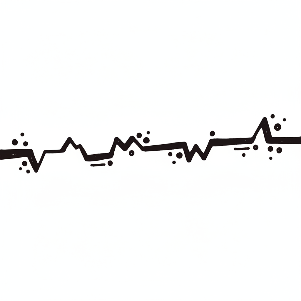 Handgezeichnete, zackige schwarze Linie mit Punkten auf weißem Grund, wie ein EKG oder Bergprofil.