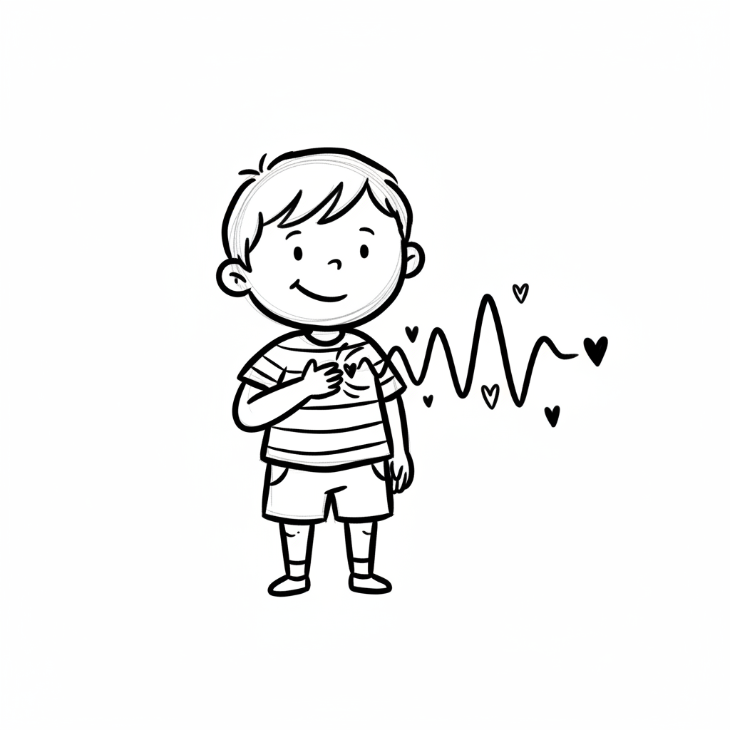 Glücklicher Cartoon-Junge mit Händen auf dem Herzen und Herzschlaglinie, symbolisiert Wohlbefinden.