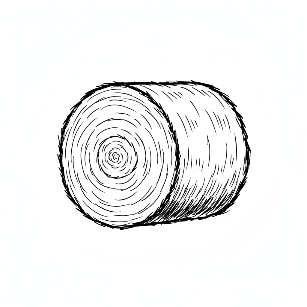 Schwarz-weiße Strichzeichnung eines runden Heuballens auf weißem Hintergrund.