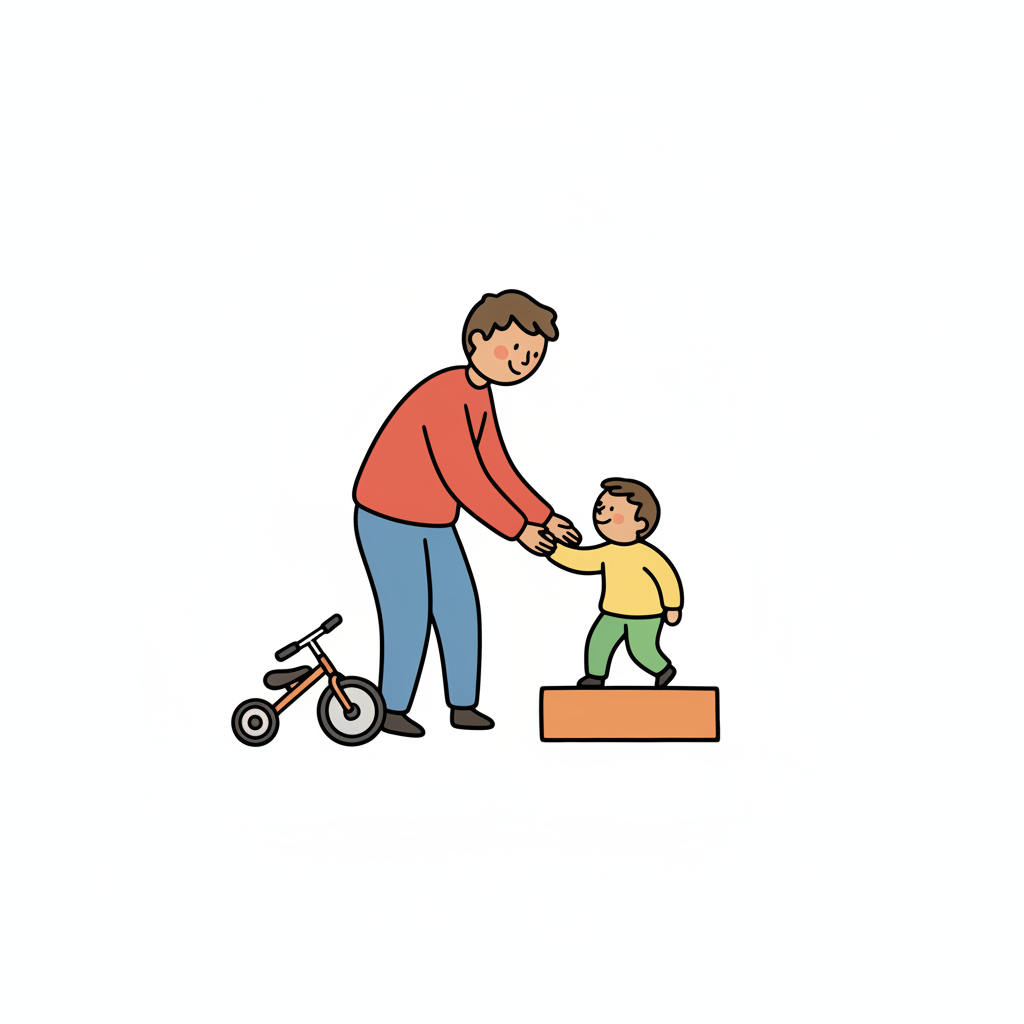 Ein Vater hilft seinem Kind beim Hochsteigen auf einen Block, hält seine Hand. Ein Dreirad steht daneben.