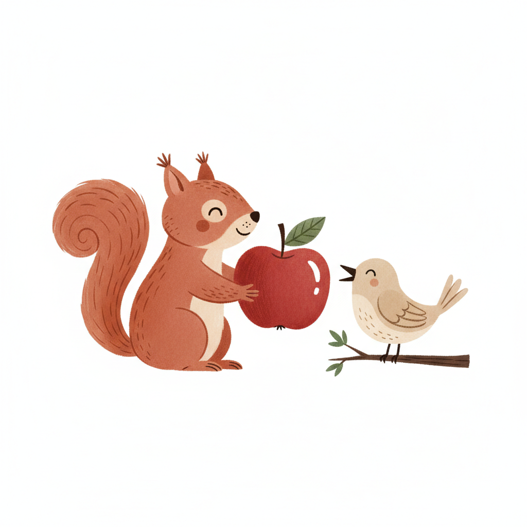 Süßes Eichhörnchen hält Apfel für singenden Vogel auf Ast.