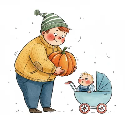 Ein Junge mit Mütze präsentiert einem Baby im Kinderwagen einen Kürbis.