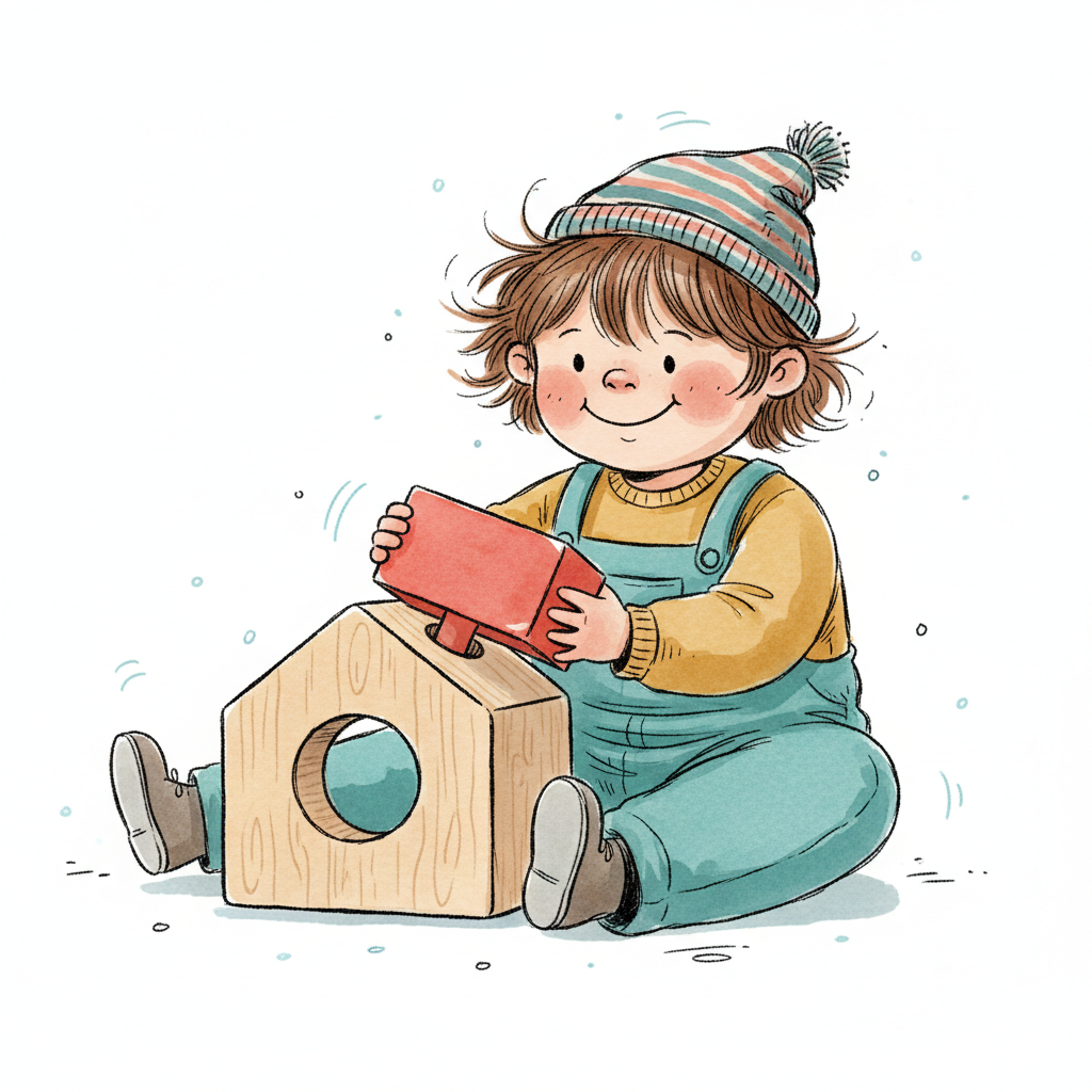Fröhliches Kind in Mütze und Latzhose spielt mit Holzblock und Formensortierer.