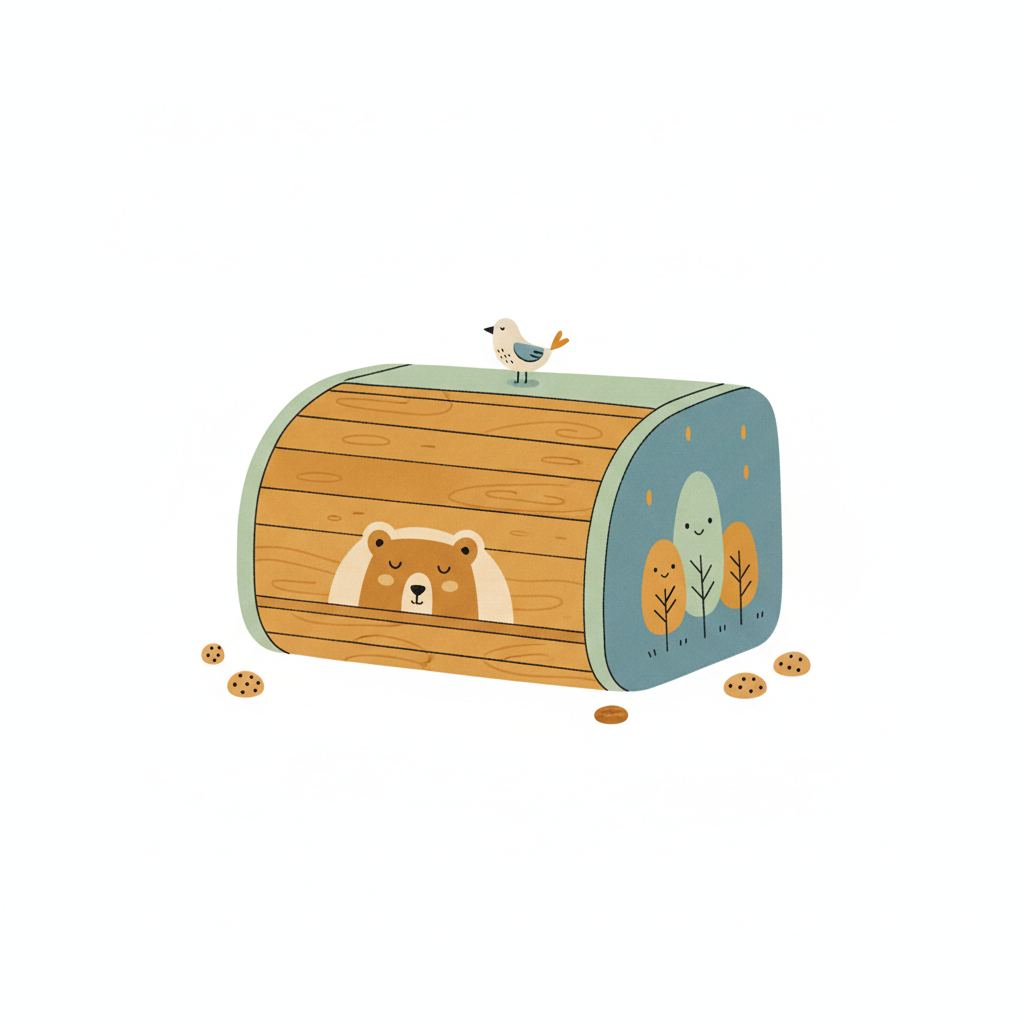 Niedliche Illustration: Bär schaut aus Holzbox, Vogel sitzt oben, Kekse liegen herum.