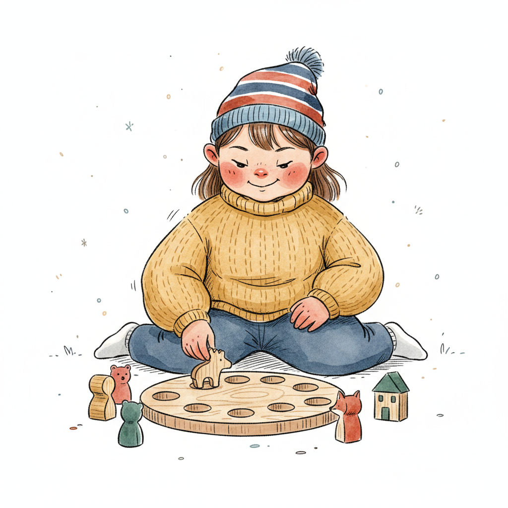 Fröhliches Kind in Mütze und Latzhose spielt mit bunten Holzfiguren auf kleinem Tisch.