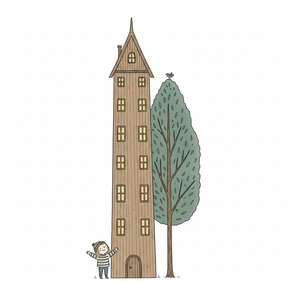 Illustration: Kind vor hohem Holzhaus und Baum mit Vogel. Gemütliche, märchenhafte Szene.