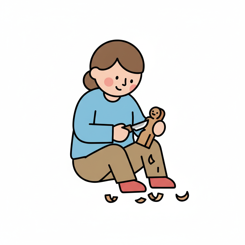 Fröhliche Person schnitzt eine Holzpuppe mit einem Messer, Späne fallen ab.