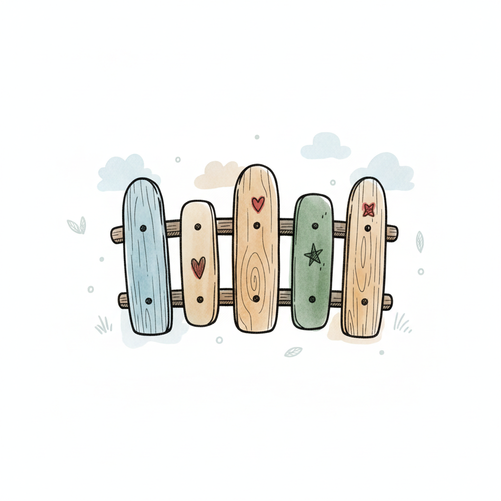 Aquarell-Illustration eines bunten Holzzauns mit Herzen und Sternen.