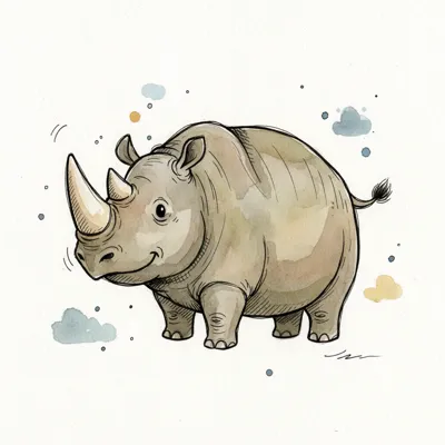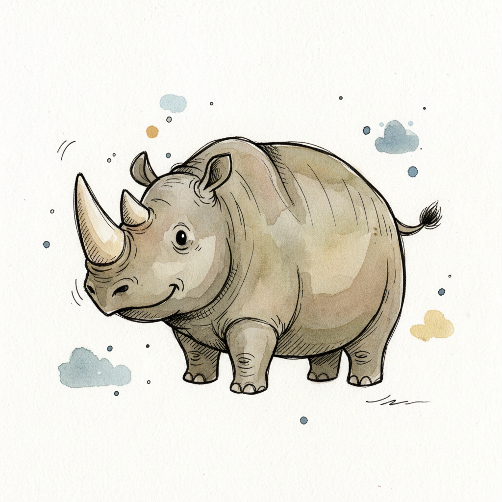 Freundliches Nashorn-Cartoon in Aquarellfarben mit schwarzen Konturen und kleinen Wolken.