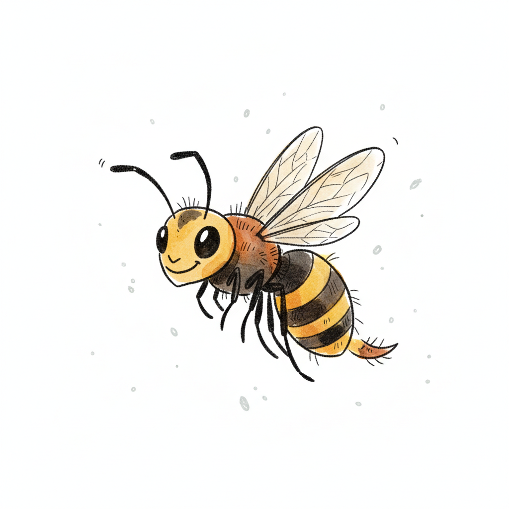 Eine freundliche, cartoonartige Biene mit großen Augen und durchsichtigen Flügeln.