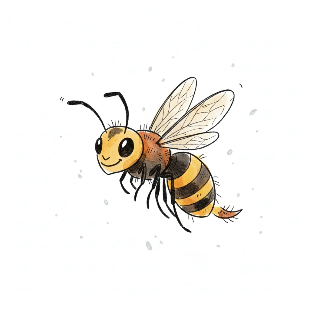 Eine lächelnde Biene fliegt fröhlich durch die Luft.