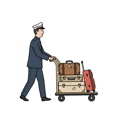 Ein Hotelpage in Uniform schiebt einen Gepäckwagen mit mehreren Koffern.