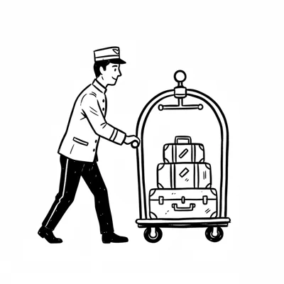Ein Hotelpage schiebt einen Gepäckwagen mit drei Koffern. Schwarz-weiße Illustration.
