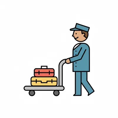 Ein Hotelpage schiebt einen Gepäckwagen mit zwei Koffern. Einfaches, farbiges Icon.