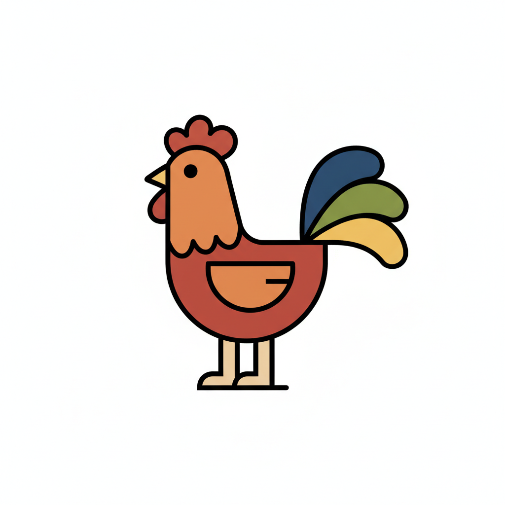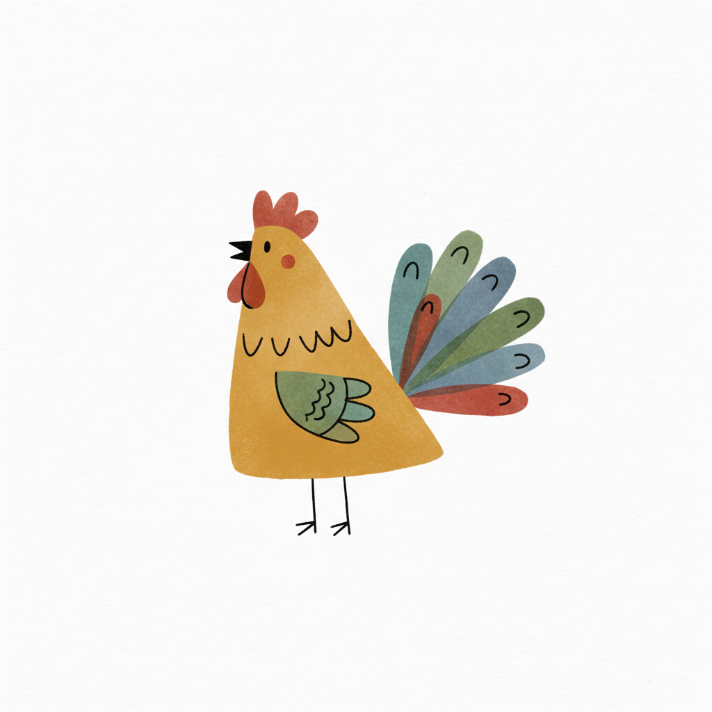 Bunt gezeichnetes Huhn mit farbenfrohem Schwanz und freundlichem Ausdruck.