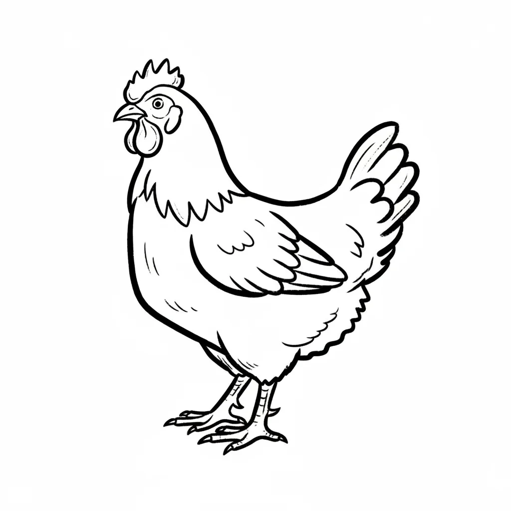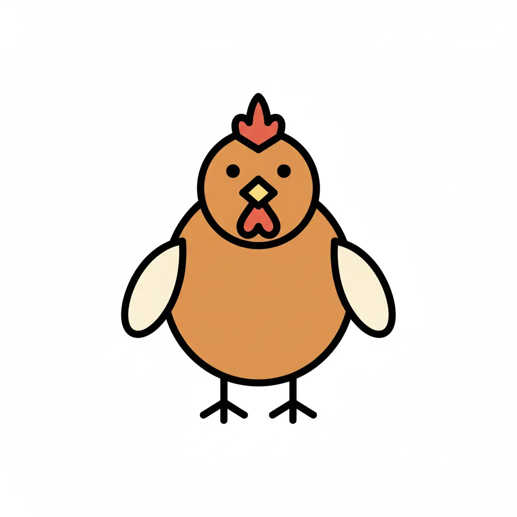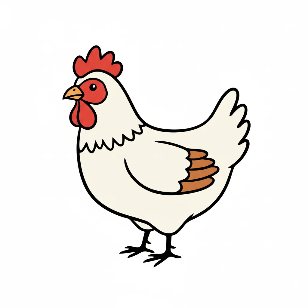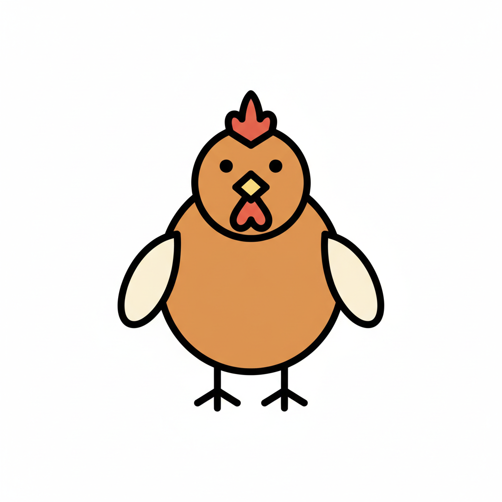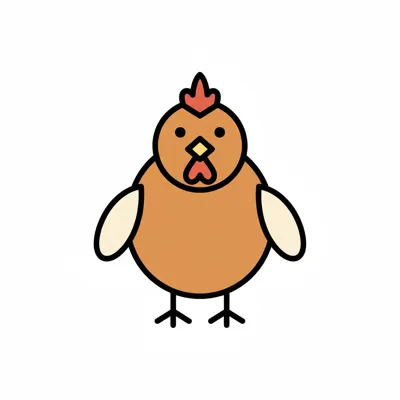 Ein cartoonhaftes Huhn mit einem runden Körper und einem auffälligen Kamm.