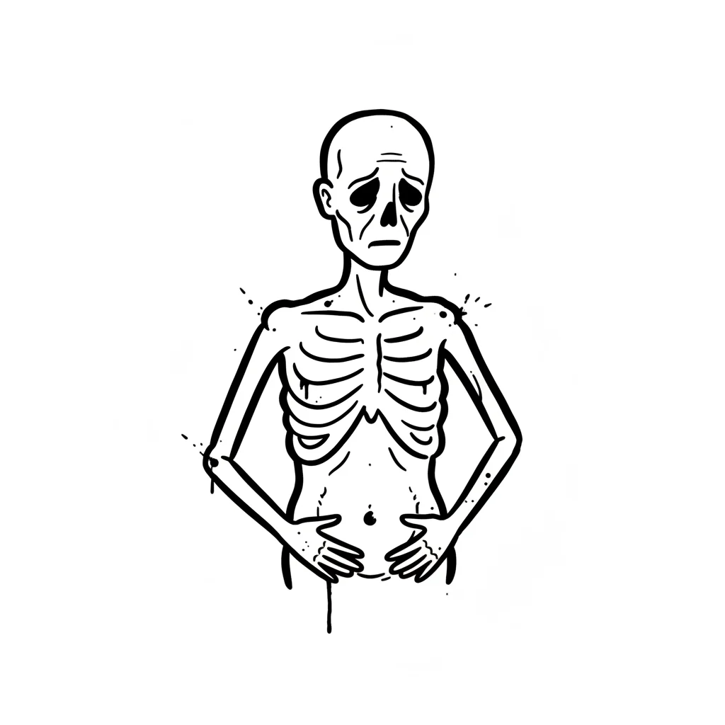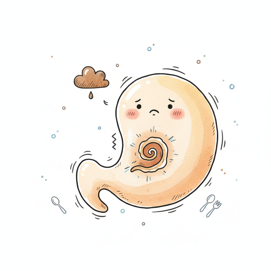 Ein trauriger Magen mit einer Spirale und Gedankenblase.