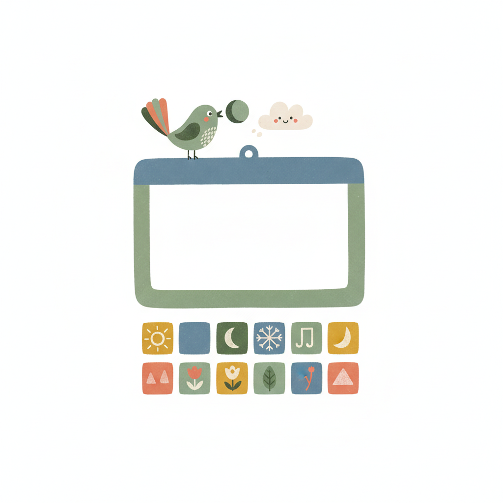 Süße Illustration: Vogel mit Mond auf Rahmen, darunter Icons für Wetter, Natur und Musik.