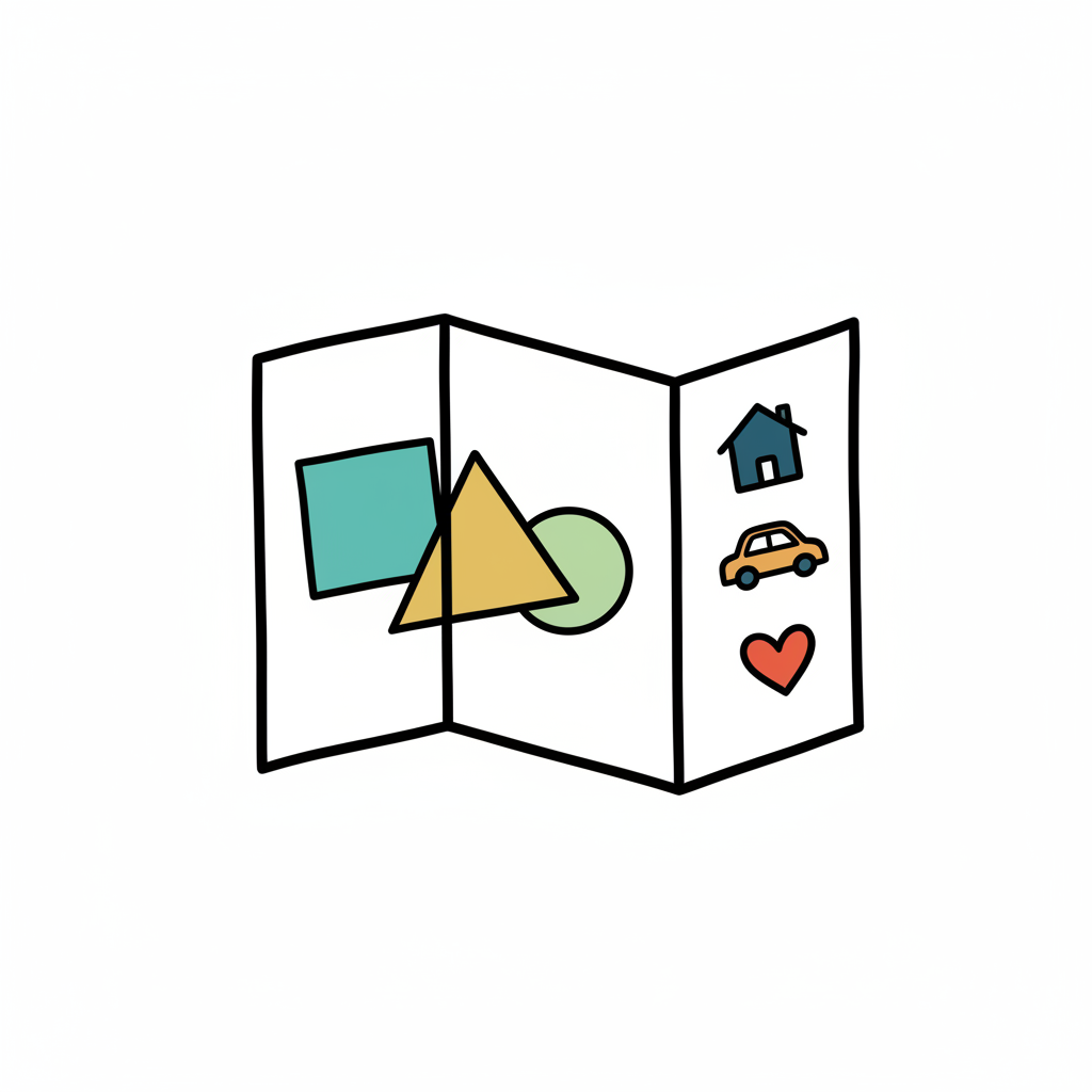 Bunte, handgezeichnete Karte mit geometrischen Formen und Icons wie Haus, Auto, Herz.