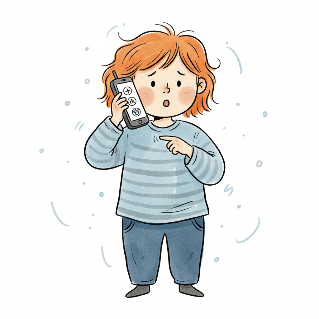 Besorgtes Kind mit rotem Haar telefoniert mit Smartphone und zeigt auf etwas. Icons auf dem Display.