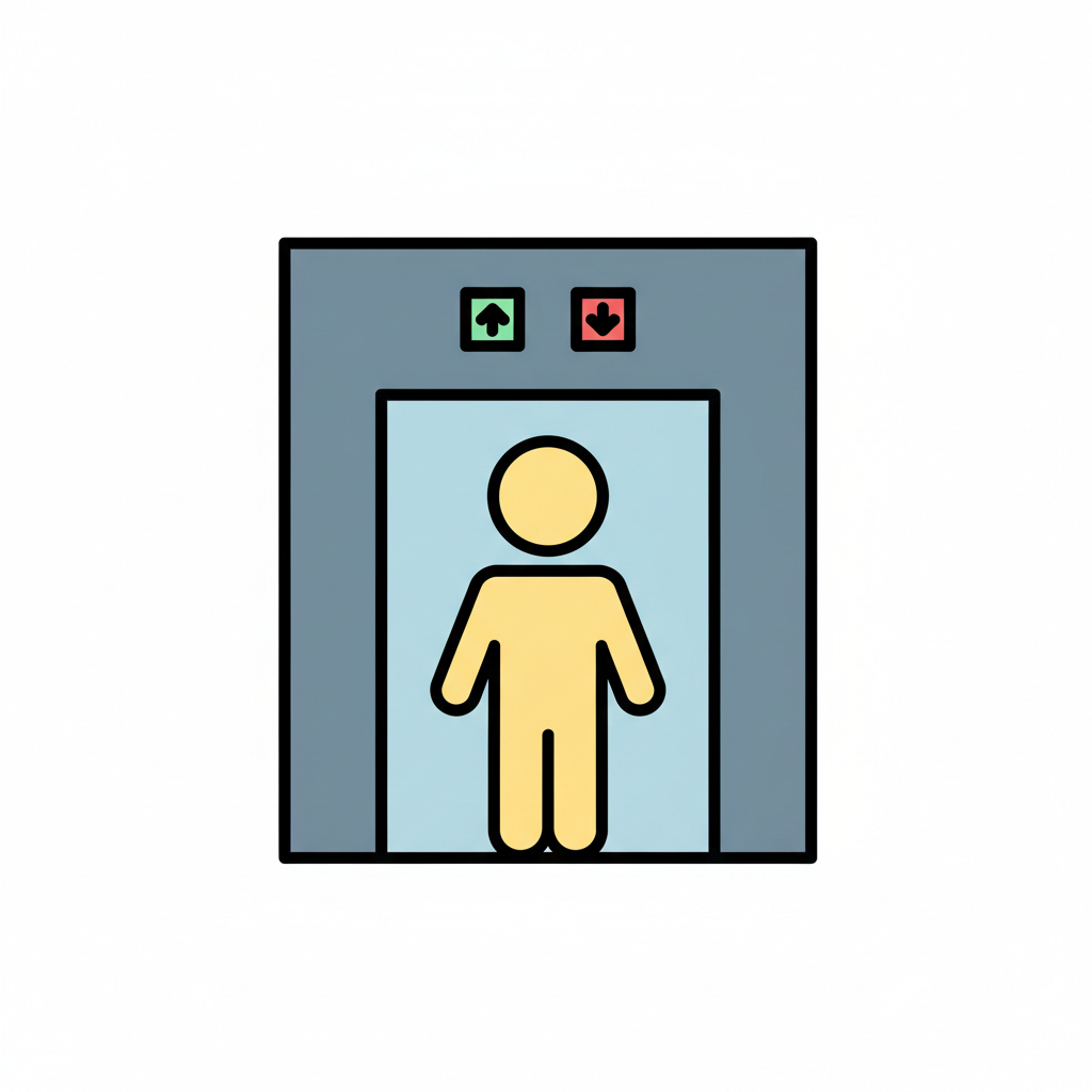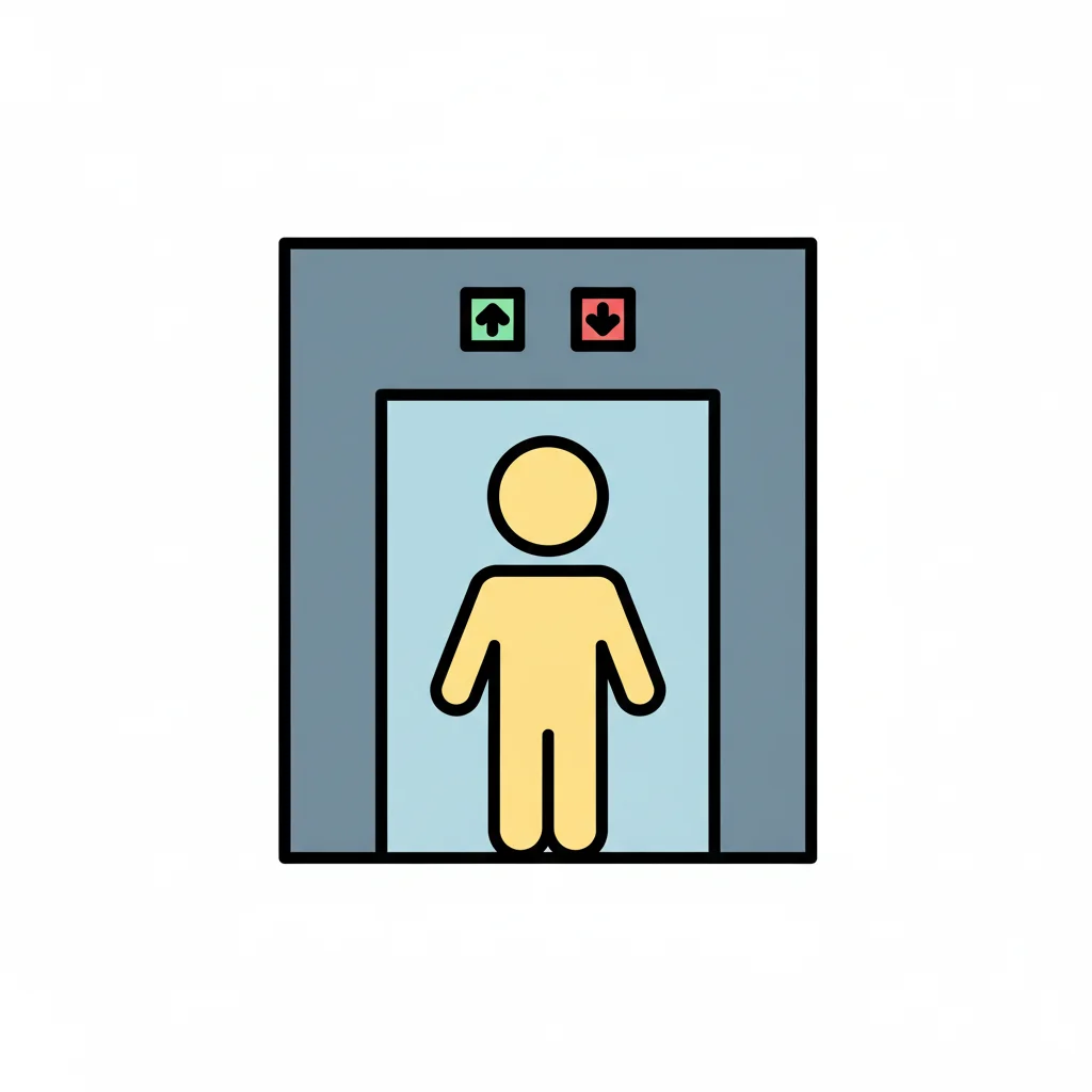 Farbige Ikone: Eine Person steht in einem Aufzug, darüber Richtungspfeile für Auf- und Abfahrt.