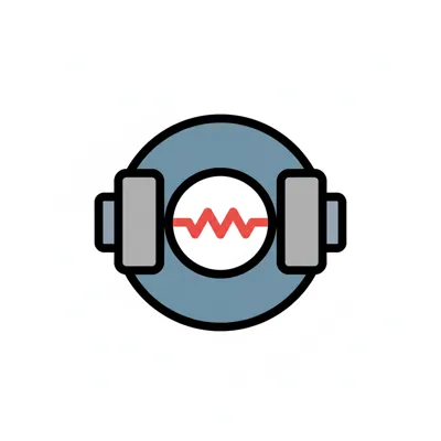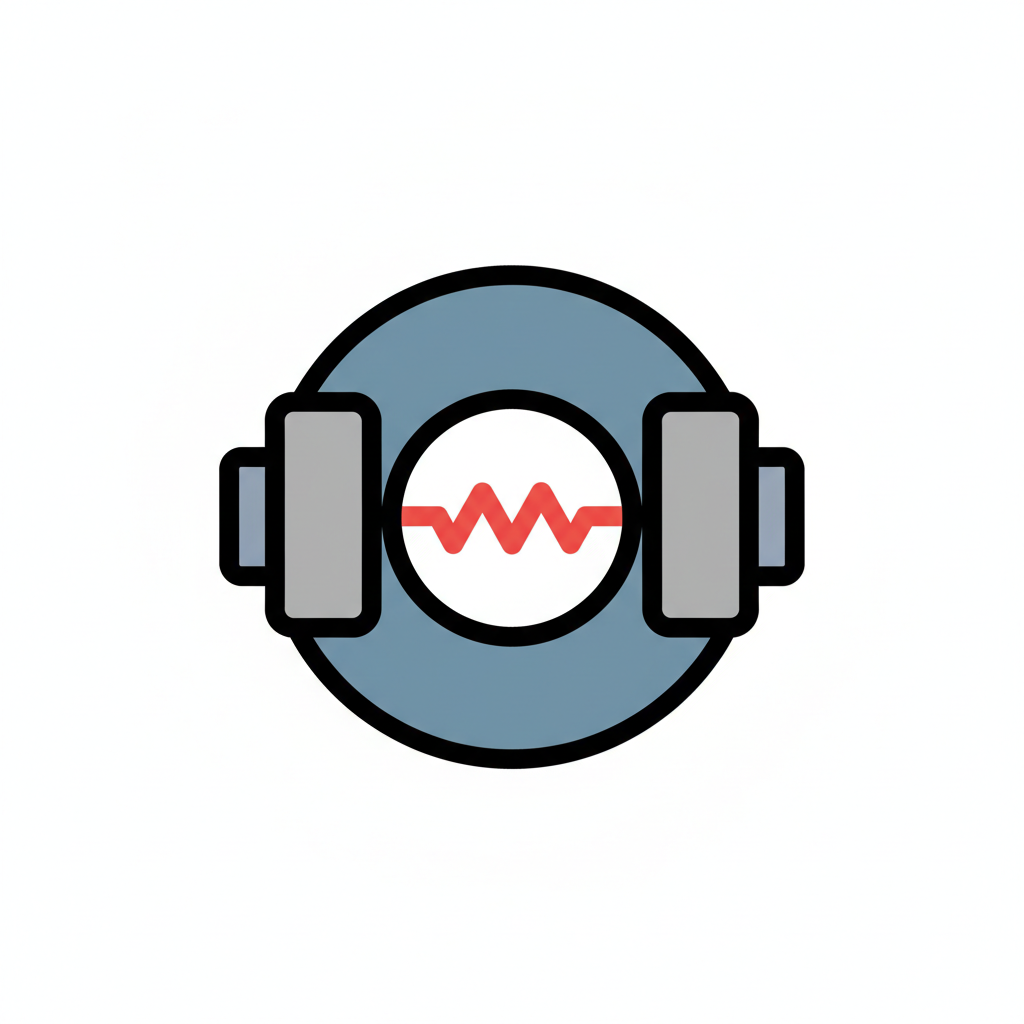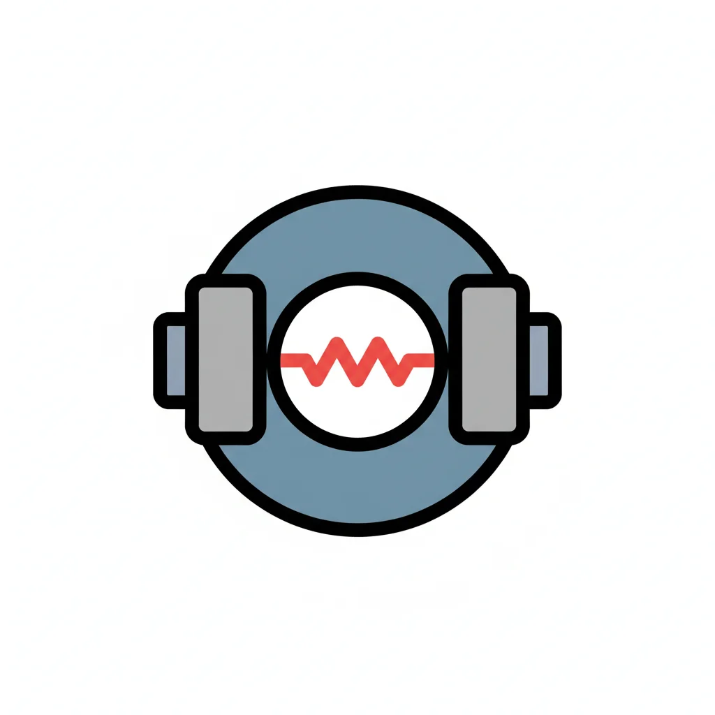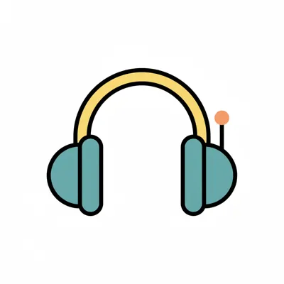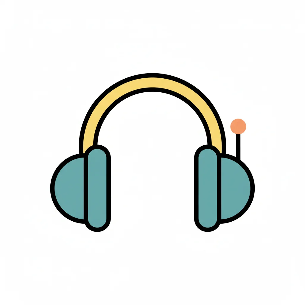 Stilisierte Kopfhörer-Ikone in Gelb und Türkis mit schwarzem Umriss und kleinem Mikrofon.