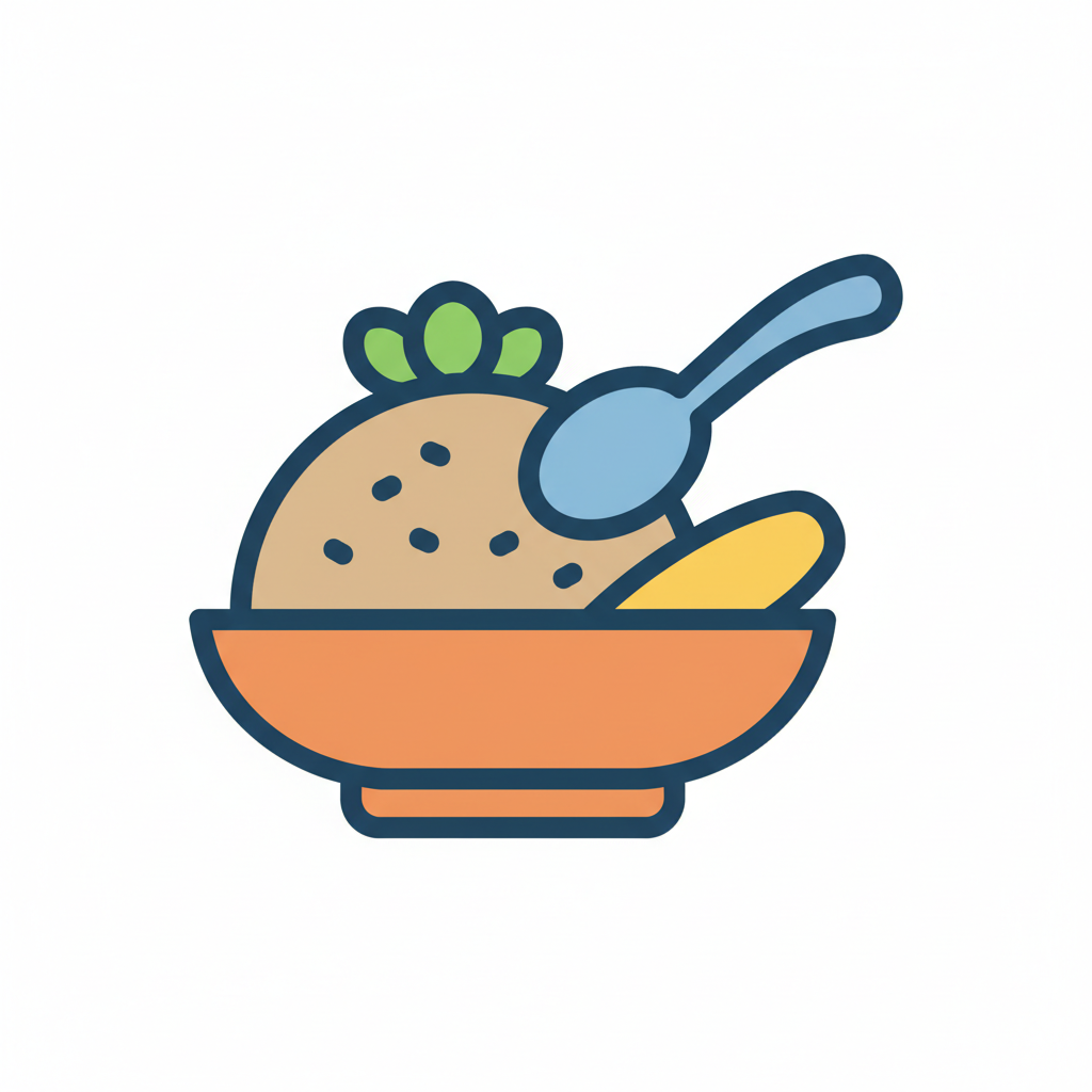 Bunte Ikone einer Schale mit Reis oder Brei, Löffel und Beilagen.