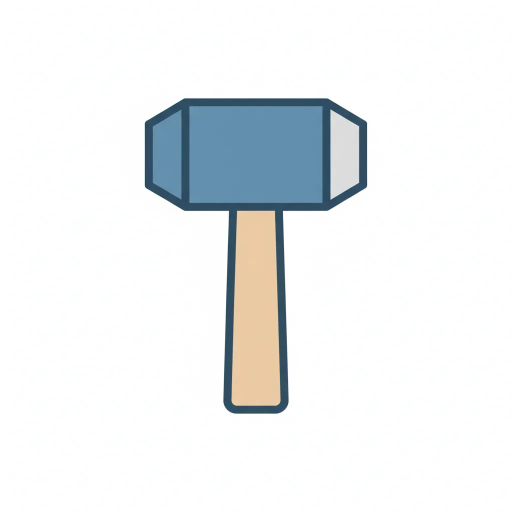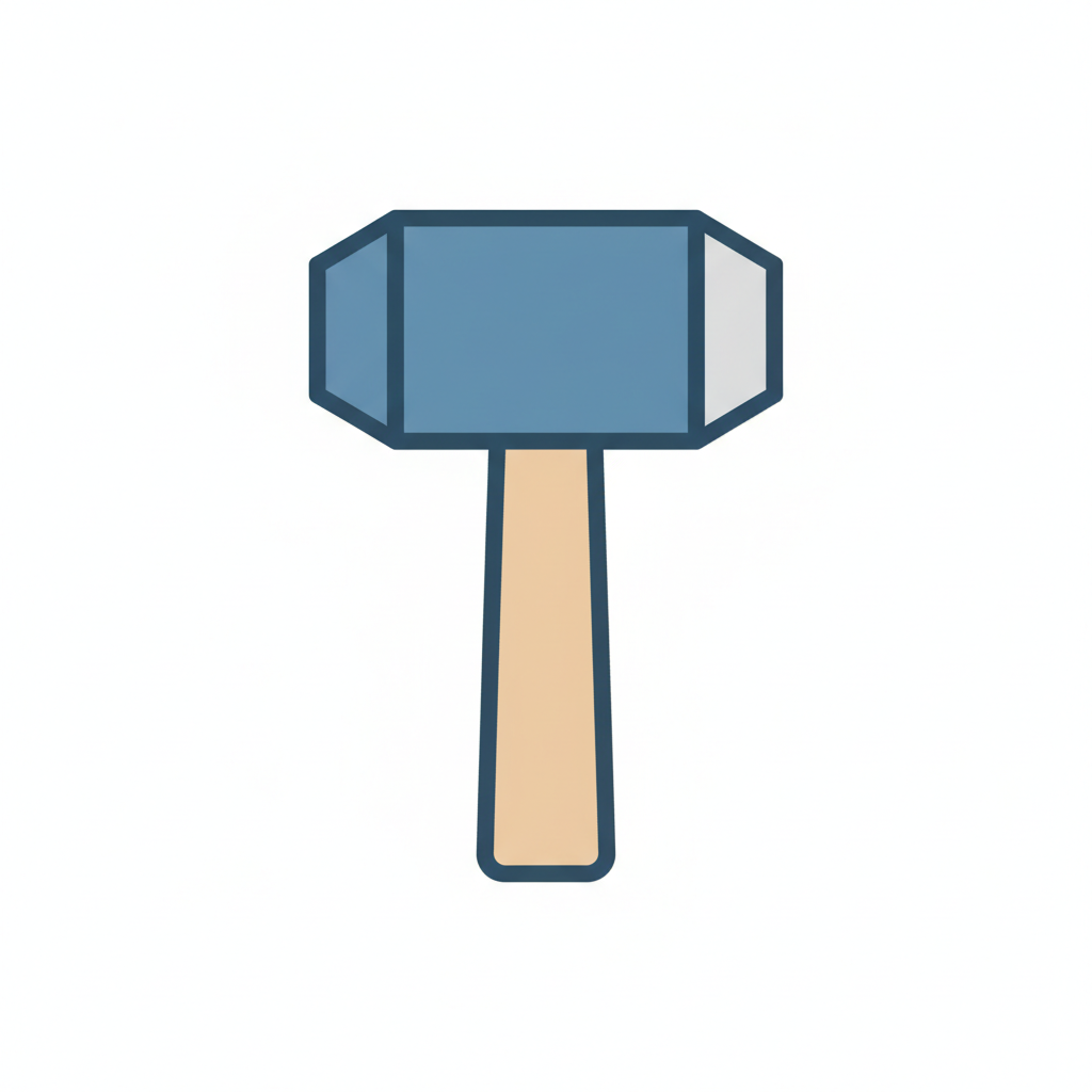 Stilisierter Hammer mit blauem Kopf und braunem Griff auf weißem Hintergrund.