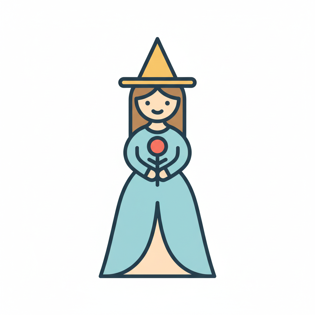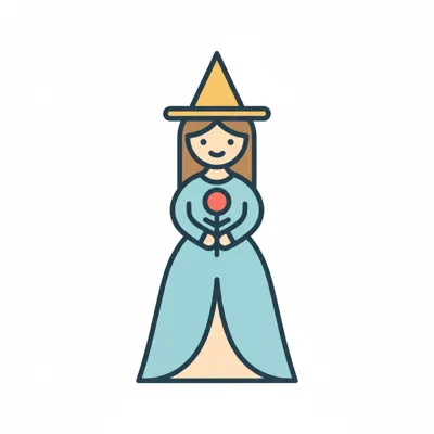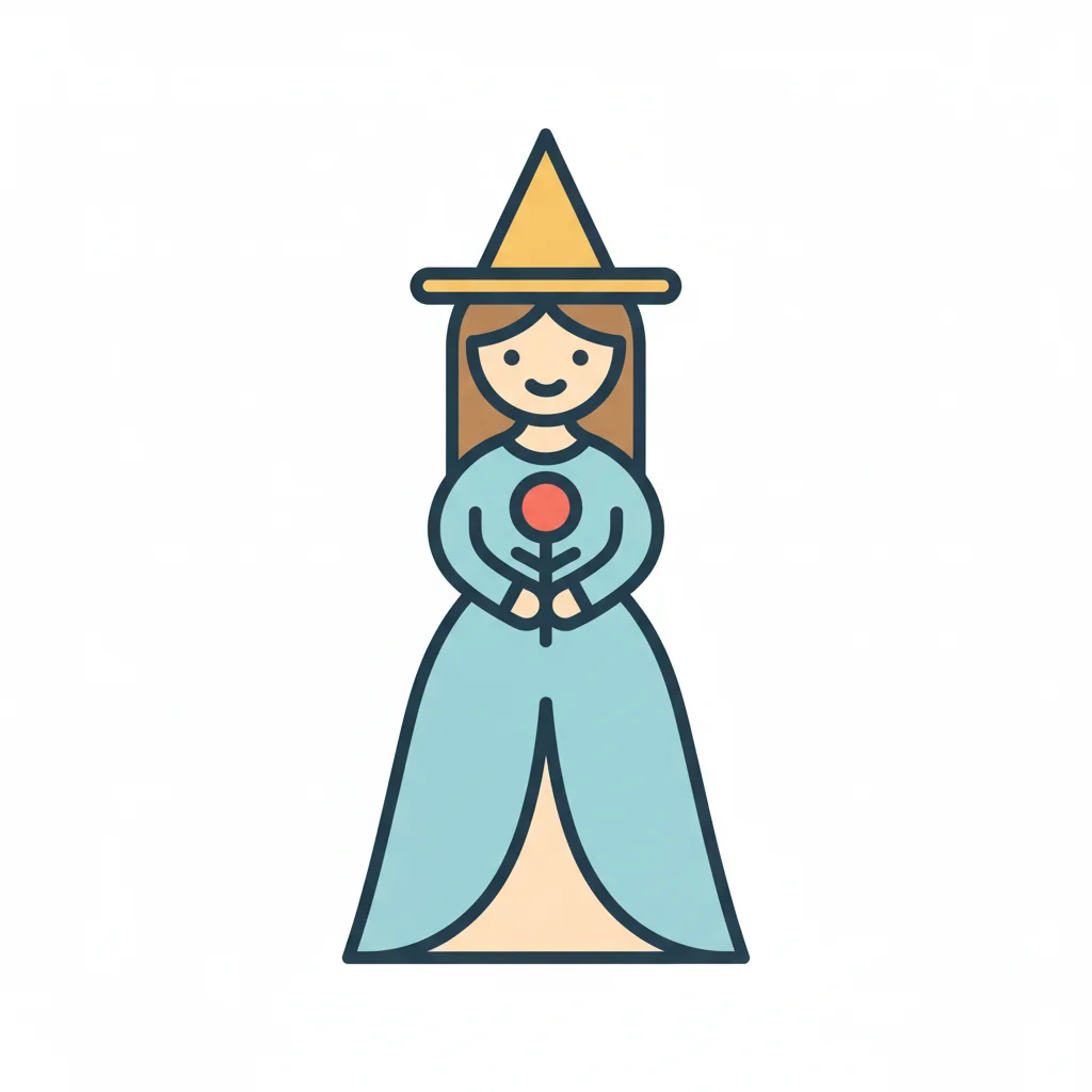 Niedliche Cartoon-Figur mit spitzem Hut, blauem Kleid und einer roten Rose in den Händen.