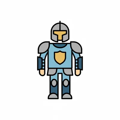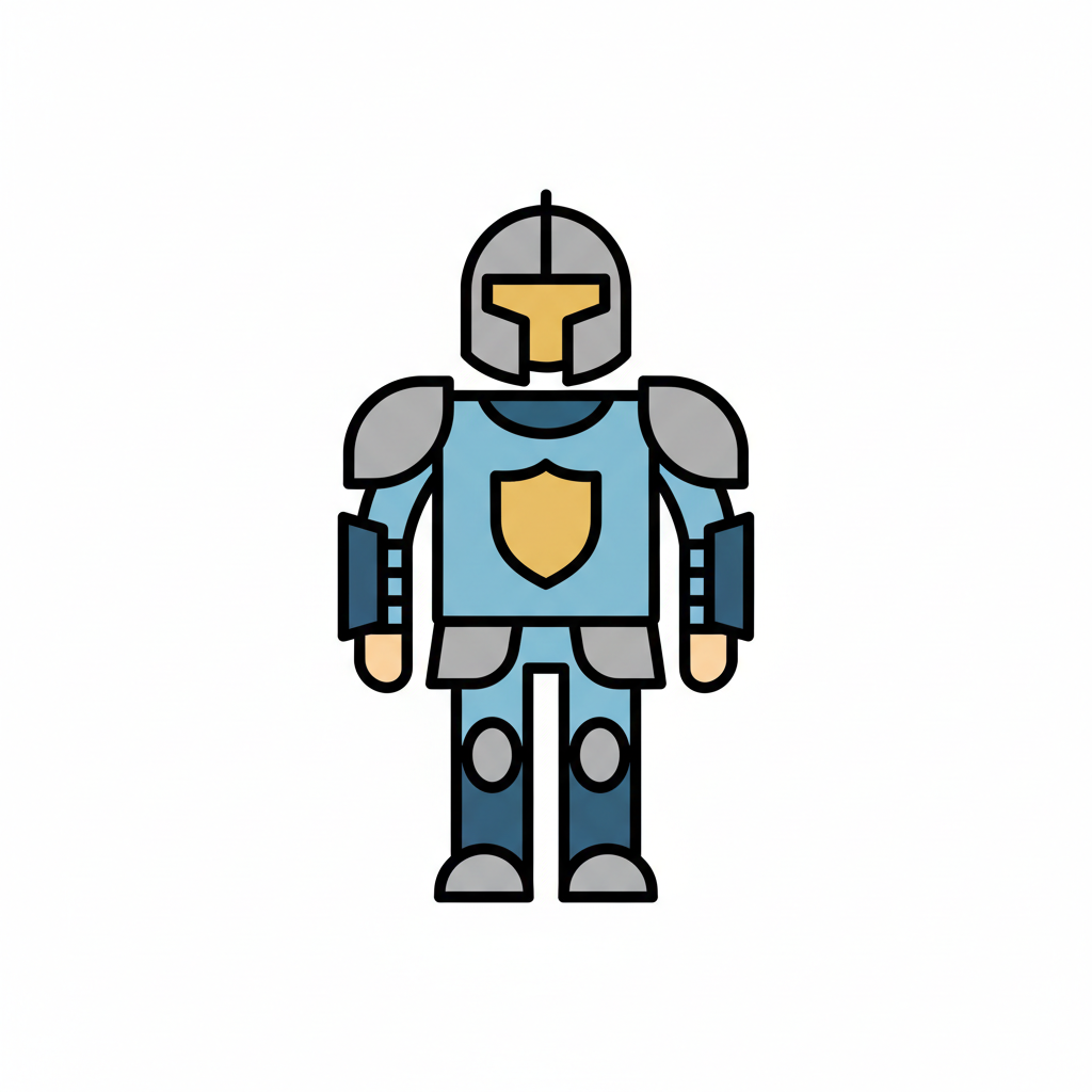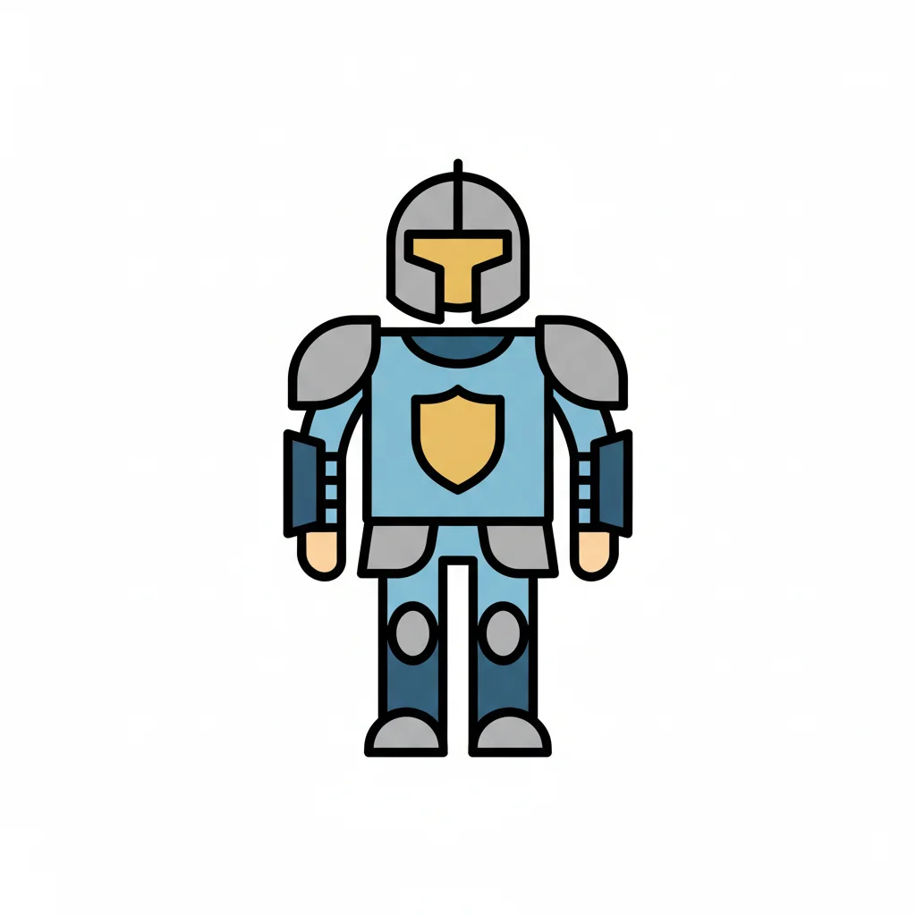 Stilisierte Illustration eines Ritters in blauer Rüstung mit goldenem Schild und Helm.